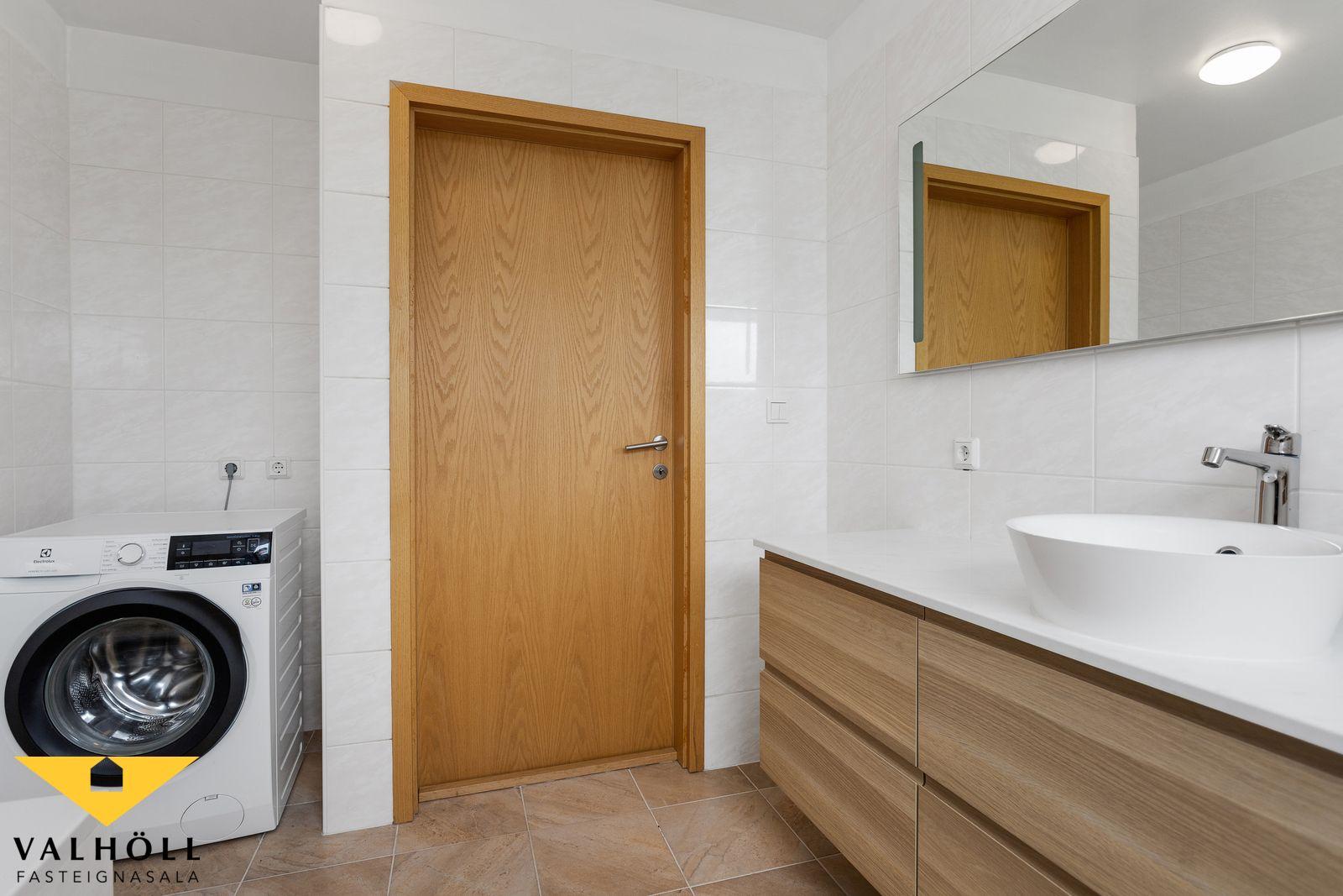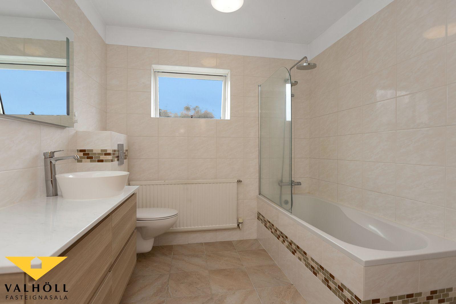 Baðherbergi: Endurnýjað árið 2017, flísalagt í hólf og gólf, með baðkari og sturtu, vaskaskáp og salerni. Rými fyrir þvottavél og þurrkara.