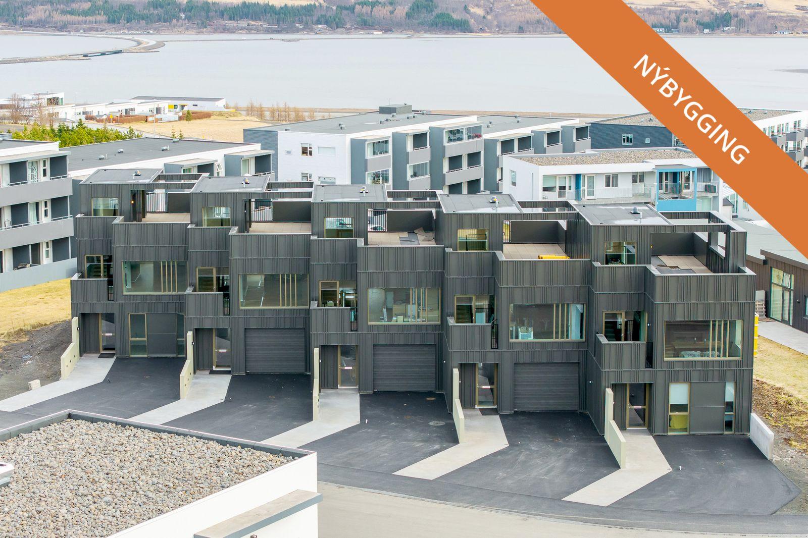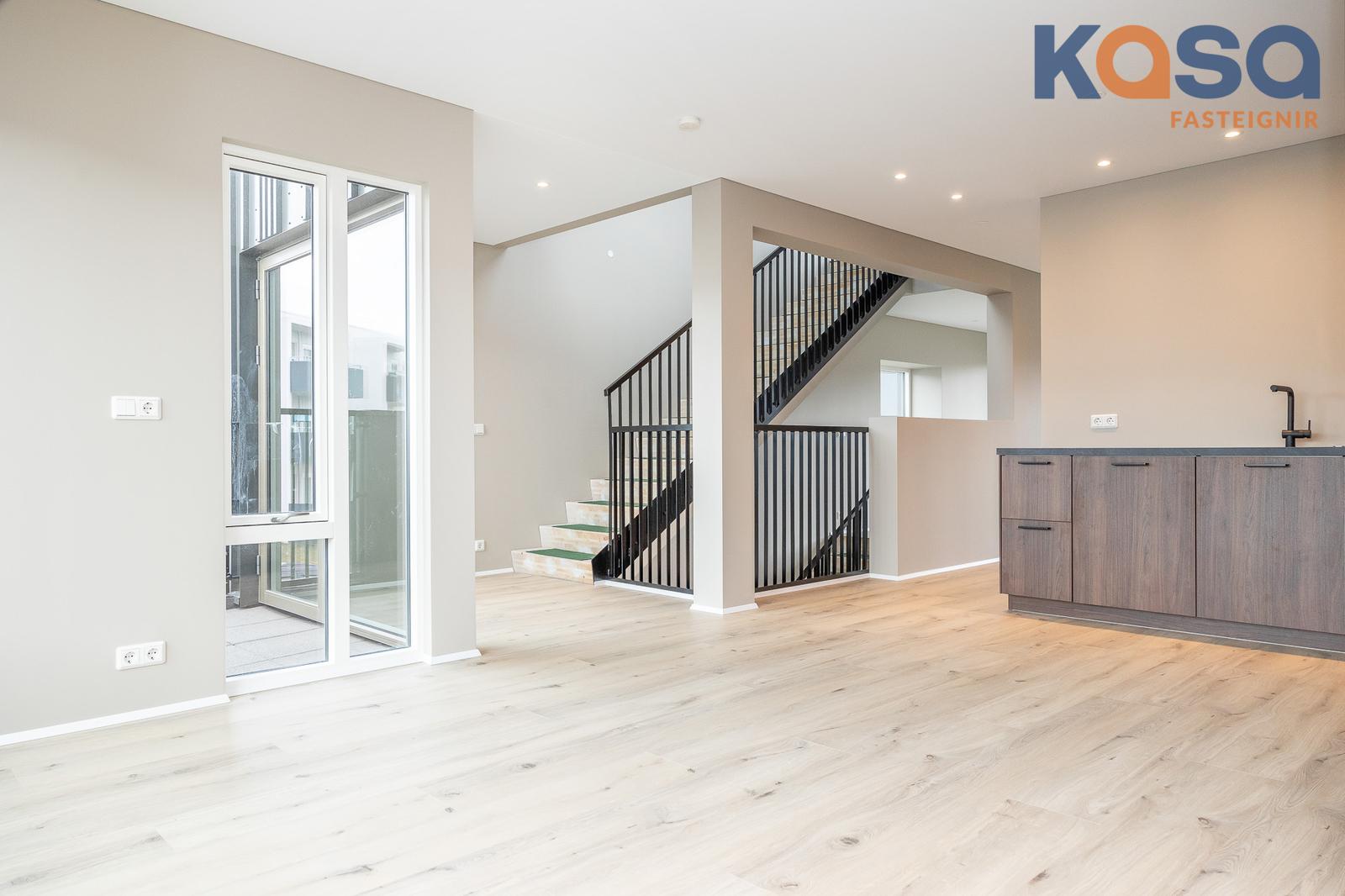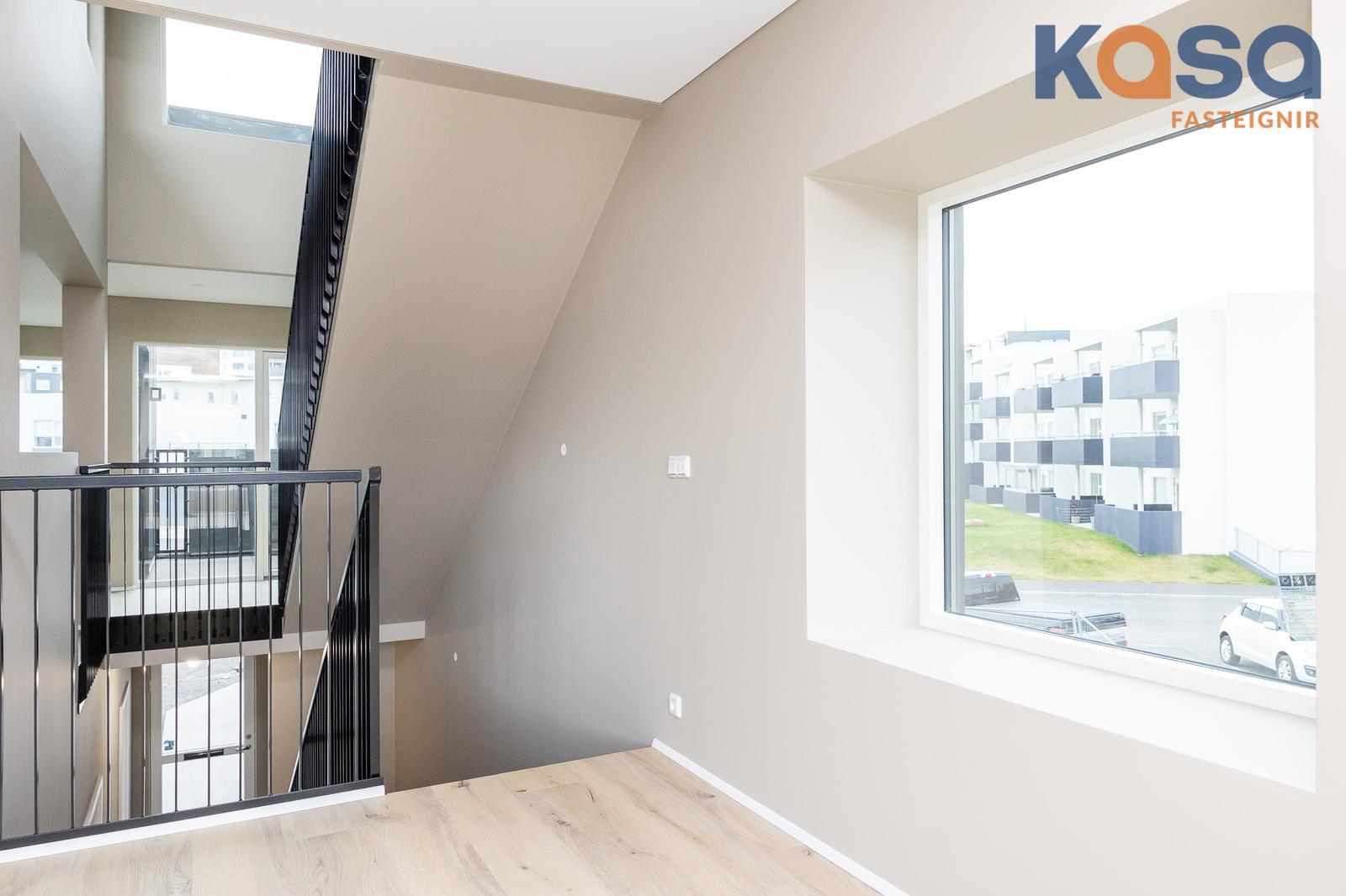 Eignin er skemmtilega hönnuð þar sem svefnrými eru á jarðhæð, stofa og eldhús á efrihæð og rúmgóð verönd á þaki eignar.