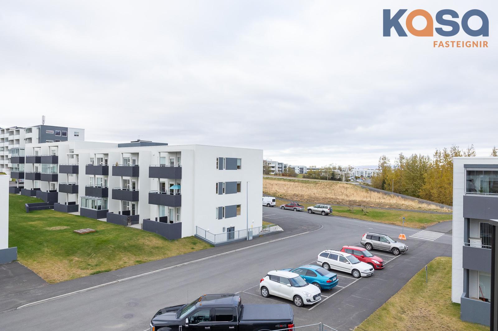 Eldhús: Vönduð innrétting í hnotulíki með grárri bekkplötu og svörtum vaski. Mjúklokun á skúffum og skápum. Hnífaparabakki og ruslafata fylgir. Innbyggður ísskápur með frysti og innbyggð uppþvottavél fylgja með við sölu eignar. Helluborð er sléttfellt og gufugleypir blæs út. Úr eldhús er gengið út á vestursvalir.