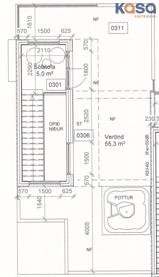 - Rúmlega 55 m² þaksvalir þar sem möguleiki er að koma fyrir heitum potti og útisturtu
