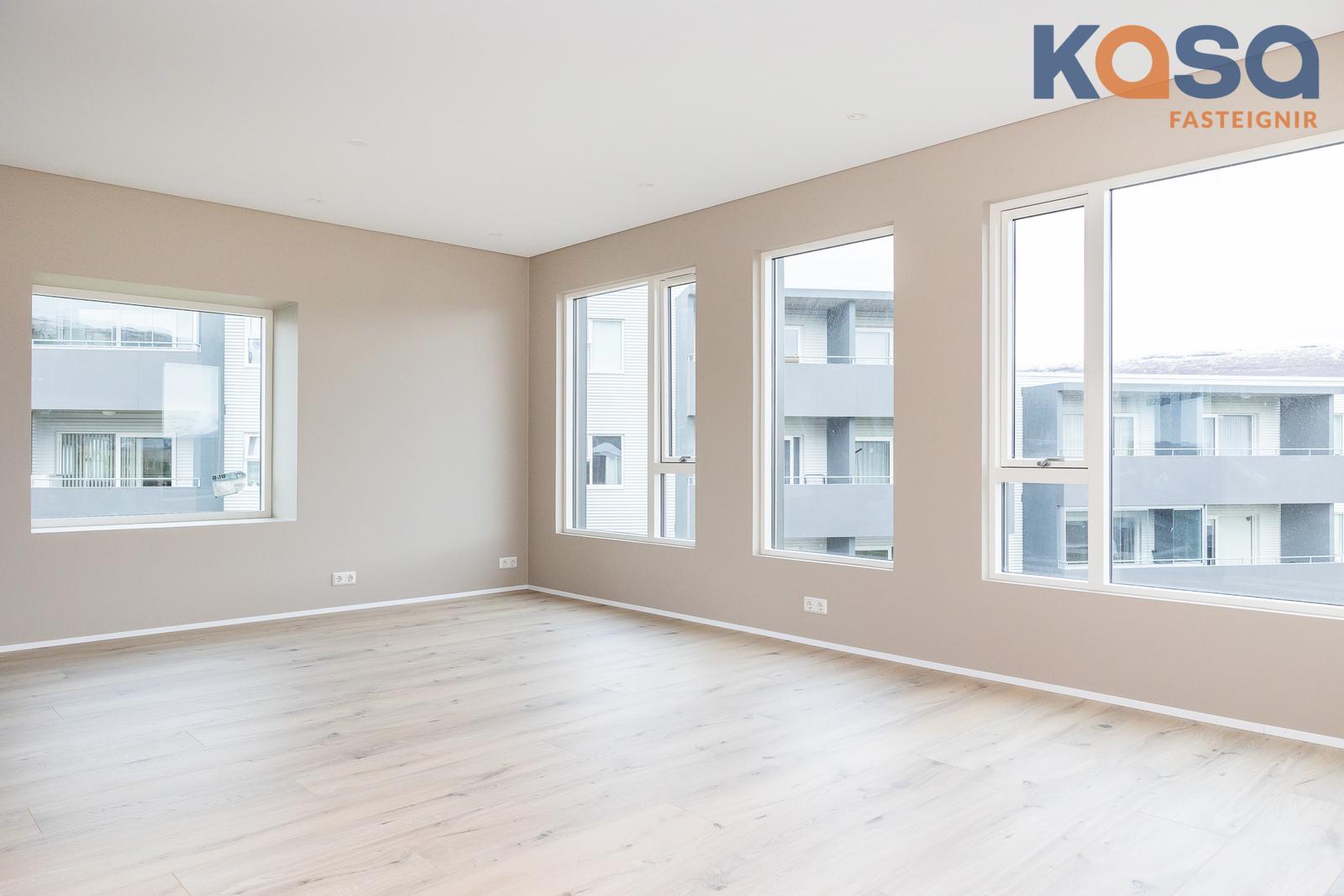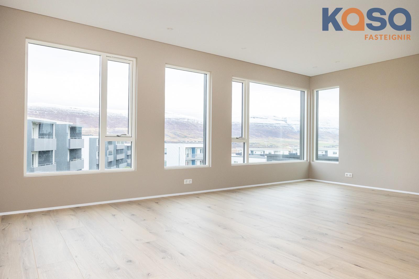 Stofa er með stórum gluggum til þriggja átta. Stofa er skv. teikningum 24,5 fm að stærð. Virkilega skemmtilegt útsýni er úr stofu.