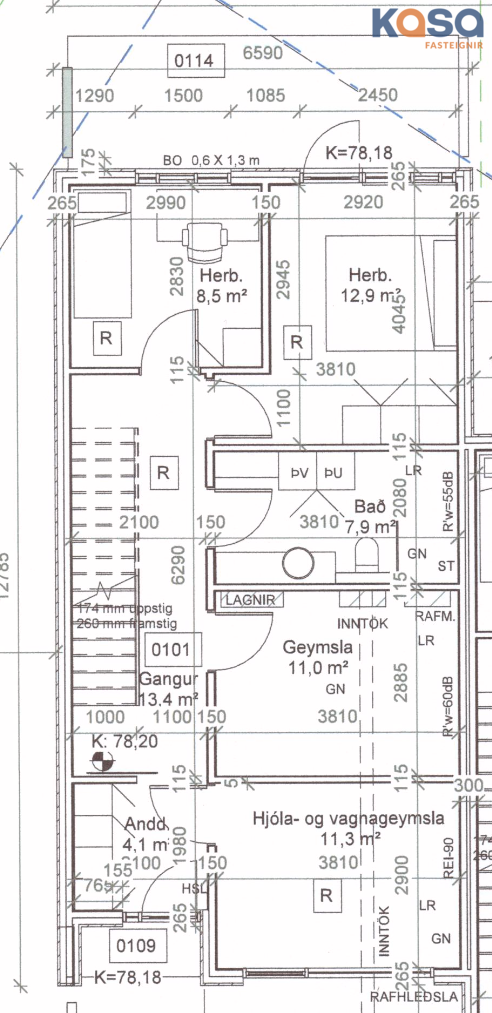 Geymsla: Þar eru inntökin fyrir eignina og rafmagnstaflan. Flísar á gólfi.