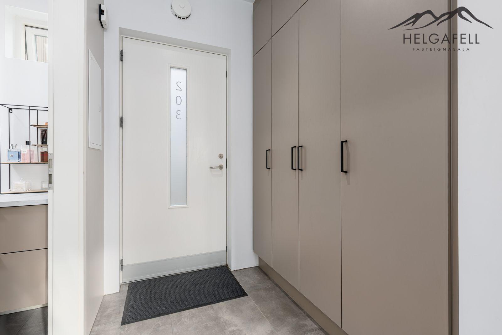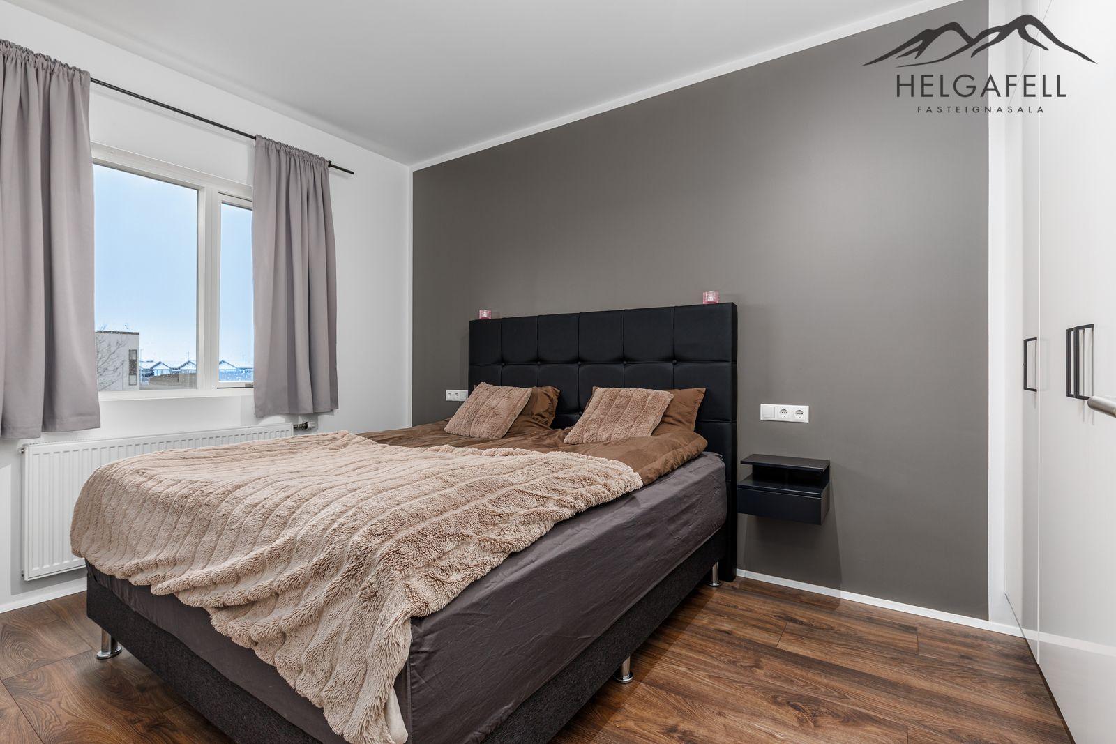 Innréttingar: Allar innréttingar eru vandaðar HTH innréttingar og er um Svansvottaða framleiðslu á þeim að ræða. Ljós mokkalit melamine filma er á eldhúsum, böðum, þvottahúsum og forstofuskápum. Fataskápar svefnherbergja sprautulakkaðir hvítir. Fataskápur er í forstofu, hjónaherbergi og barnaherbergjum ná upp í loft með aðfellu. Innvols innréttinga og fataskápa er hvítt. Eldhúsinnrétting er með harðplastlagðri borðplötu. Skúffur eru með mjúklokun. er innbyggður í innréttingu. Led lýsing er undir efri skápum. Innihurðar eru yfirfelldar plastlagðar hvítar hurðar með hurðarhúnum úr stáli. Heimilistæki eru að viðurkenndri gerð, AEG frá Ormsson þ.e. spanhelluborð og bakaraofn með sjálfhreinsikerfi. Innbyggður ísskápur og uppþvottavél. Í eldhúsi er eldhúsvaskur með blöndunartæki. Hreinlætistæki eru að viðurkenndri gerð. Á baðherbergi er vegghengt salerni. Baðinnrétting með handlaug og blöndunartæki, handklæðaofnar. Blöndunartæki í sturtu eru utanáliggjandi sturtutæki. Tengi er fyrir þvottavél og þurrkara á baðherbergi.