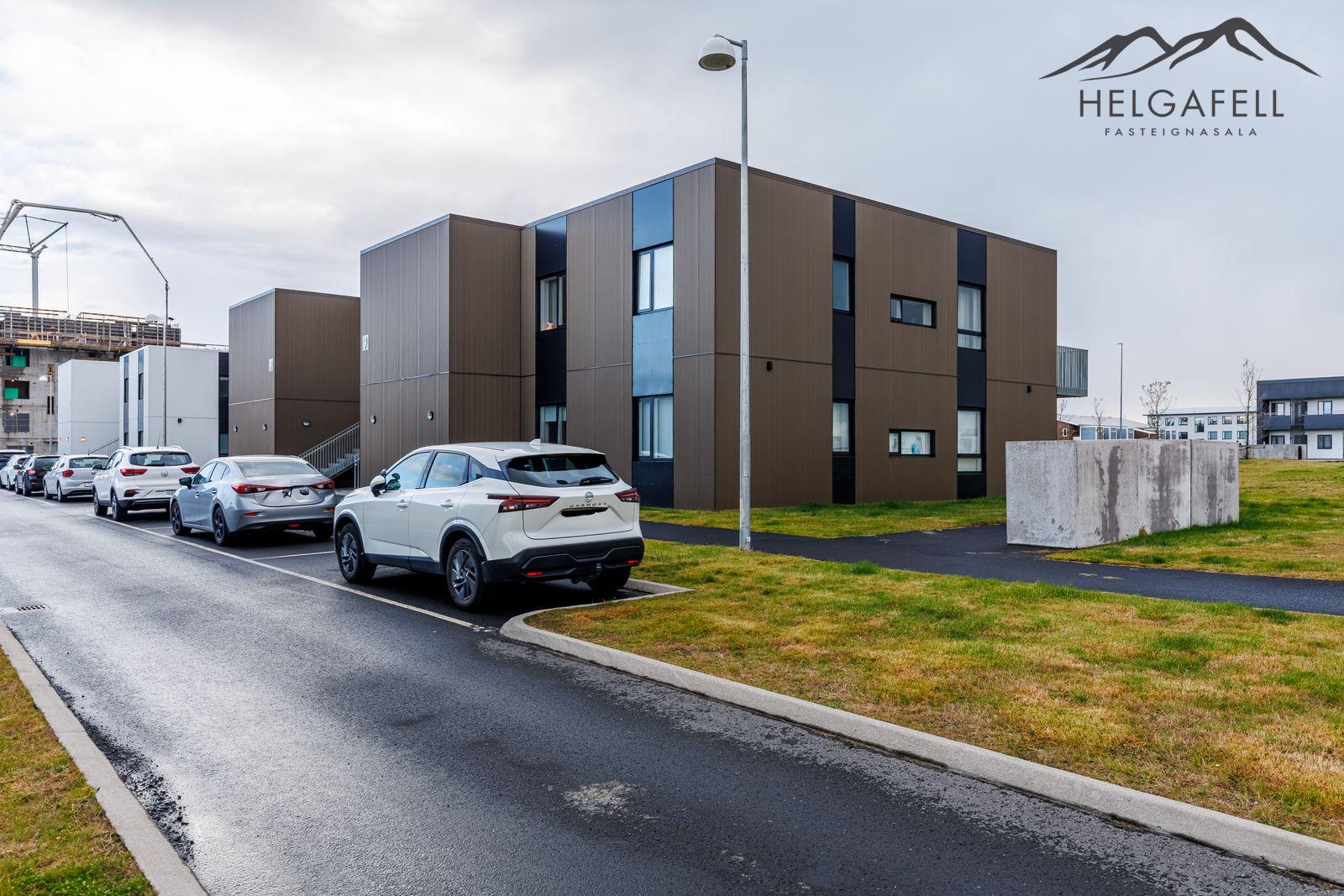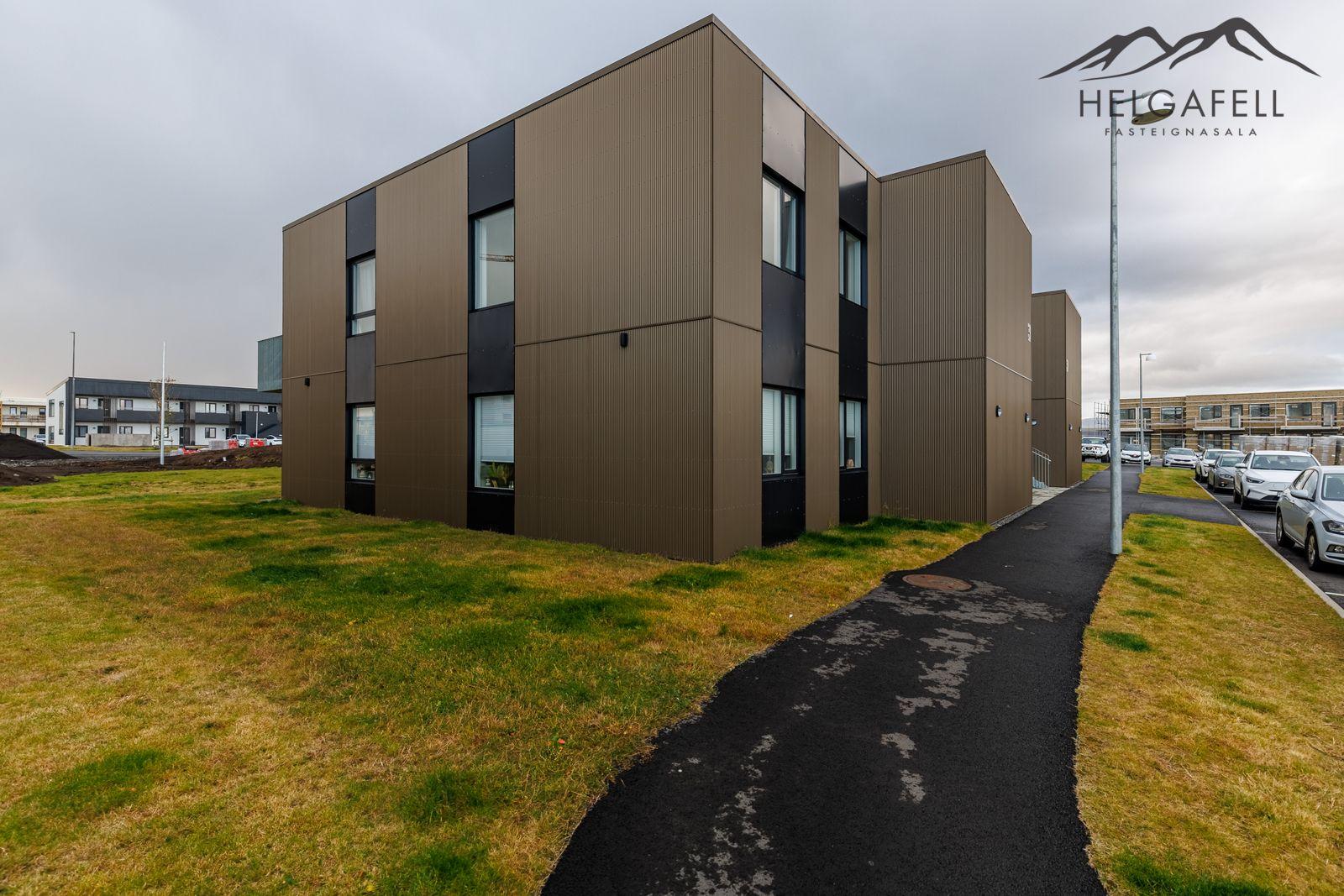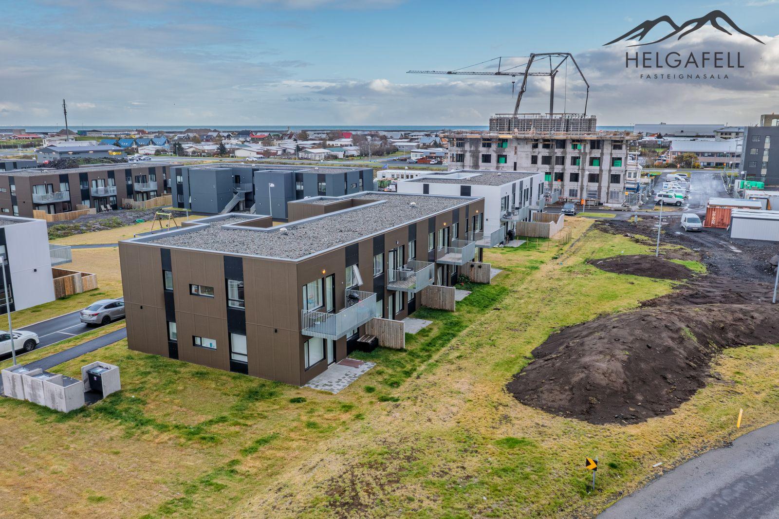 Lóðin: Gangstétt framan við húsið er hellulögð og með , aðrir hlutar lóðar verða þökulagðir. Eitt bílastæði fylgir hverri íbúða auk gestastæða framan við húsið. Á milli húsanna er leikvöllur og þökulagt svæði.
