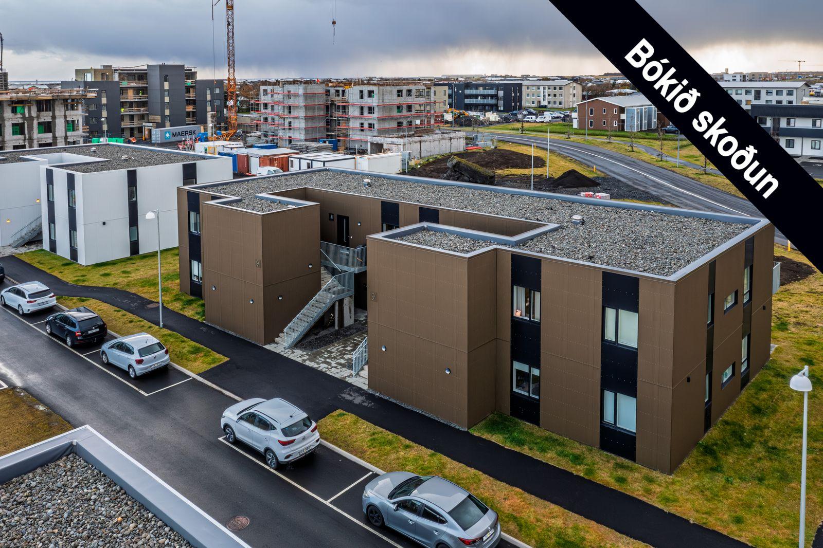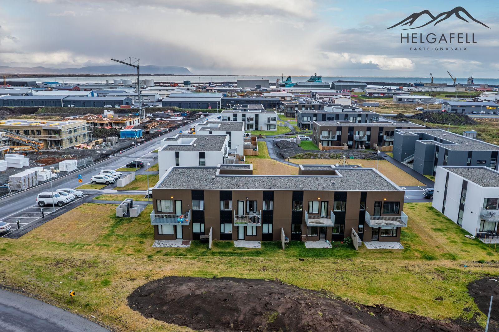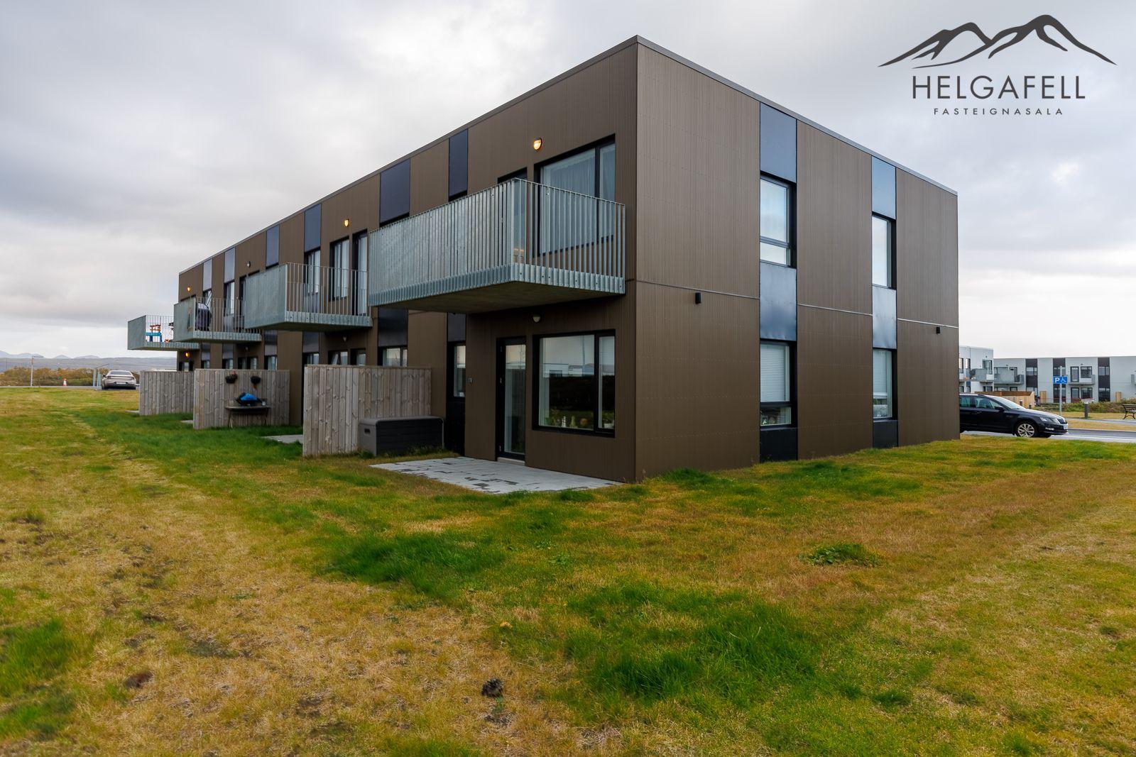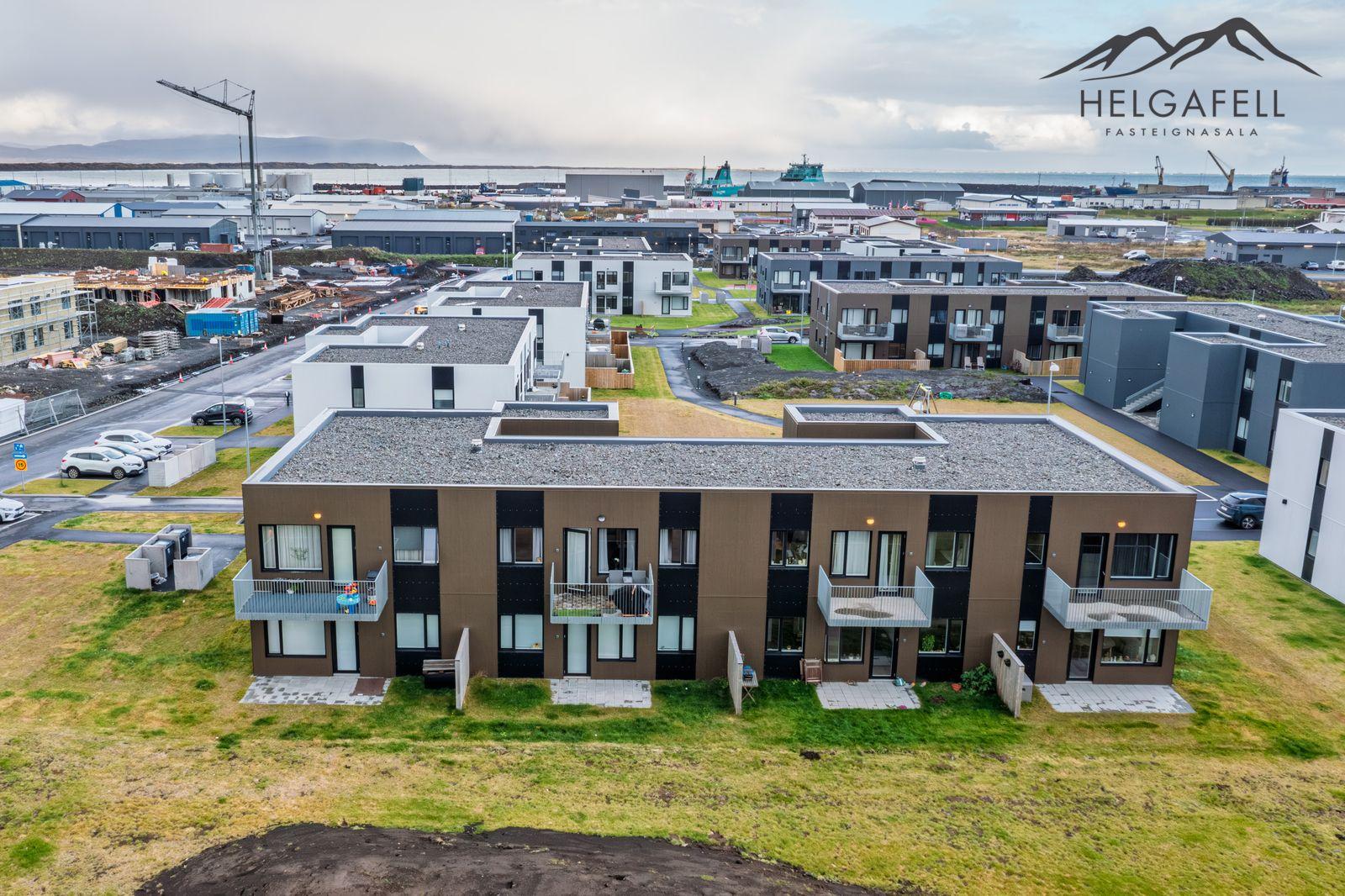 Lóðin: Gangstétt framan við húsið er hellulögð og með , aðrir hlutar lóðar verða þökulagðir. Eitt bílastæði fylgir hverri íbúða auk gestastæða framan við húsið. Á milli húsanna er leikvöllur og þökulagt svæði.