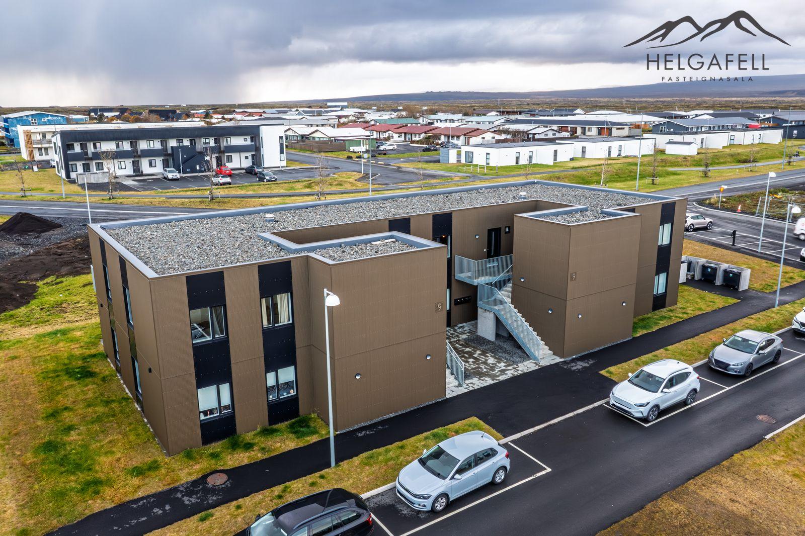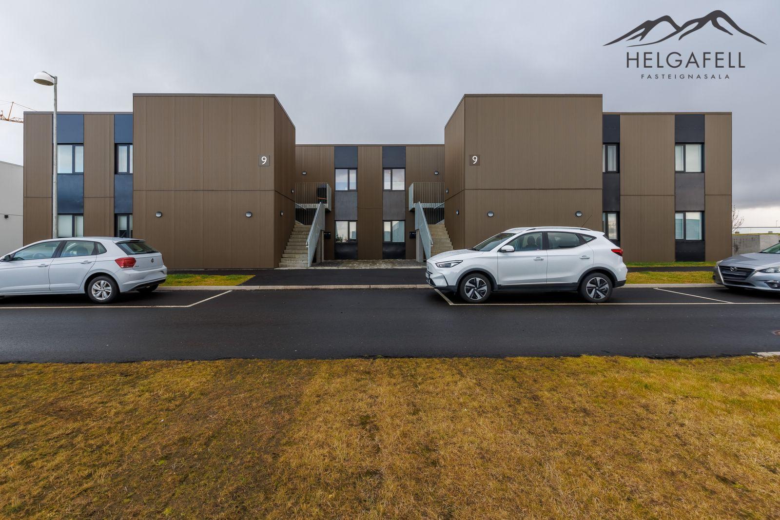 Nánar um húsið og eignirnar: Klettamói 9 er átta íbúða tvílyft hús. Á hvorri hæð eru fjórar íbúðir og geymslur eru staðsettar á í sameiginlegu tæknirými á hæðinni. Allir útveggir ásamt berandi innveggjum og milligólf eru staðsteypt. Gólfplötur milli íbúða eru staðsteyptar einnig eru stigar, svalir og svalagangar staðsteypt eða steypueiningar með endanlegu yfirborði. Útveggir eru einangraðir að utan og klæddir með smábáru og sléttri málmklæðningu að hluta. Þak er viðsnúið með pvc dúk. Gluggar og svalahurðar eru timbur/álkerfi, glerjaðir með tvöföldu K-gleri. Útihurðar og geymsluhurðar eru massífar timburhurðar. Svala og stigahandrið er galvaníserað stálhandrið með lóðréttum pílárum. Lýsing er á svalagöngum og svölum. Innveggir íbúða eru sandsparstlaðir, grunnaðir og málaðir. Léttir innveggir eru úr gifsi á stálgrind, sandsparstlaðir og málaðir. Loft íbúða verða sandspörsluð, grunnuð og máluð.