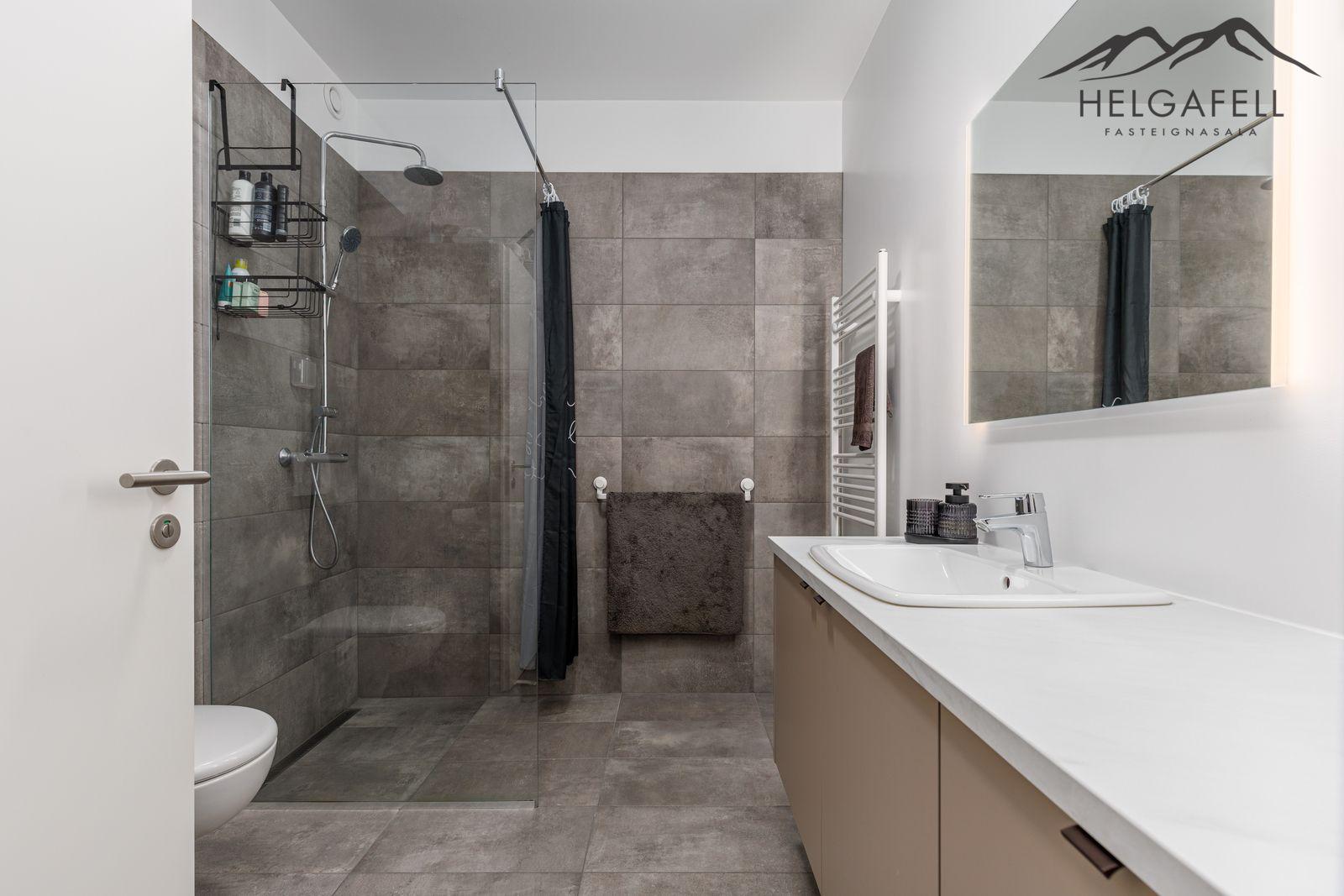 Baðherbergi / þvottaherbergi: Með fallegri baðinnrétting með handlaug í borði, walk in sturta með 30x60 flísum, upphengt salerni, handklæðaofn, flísalagt gólf og hluta veggja. Innrétting og tengi fyrir þvottavélar og þurrkara.