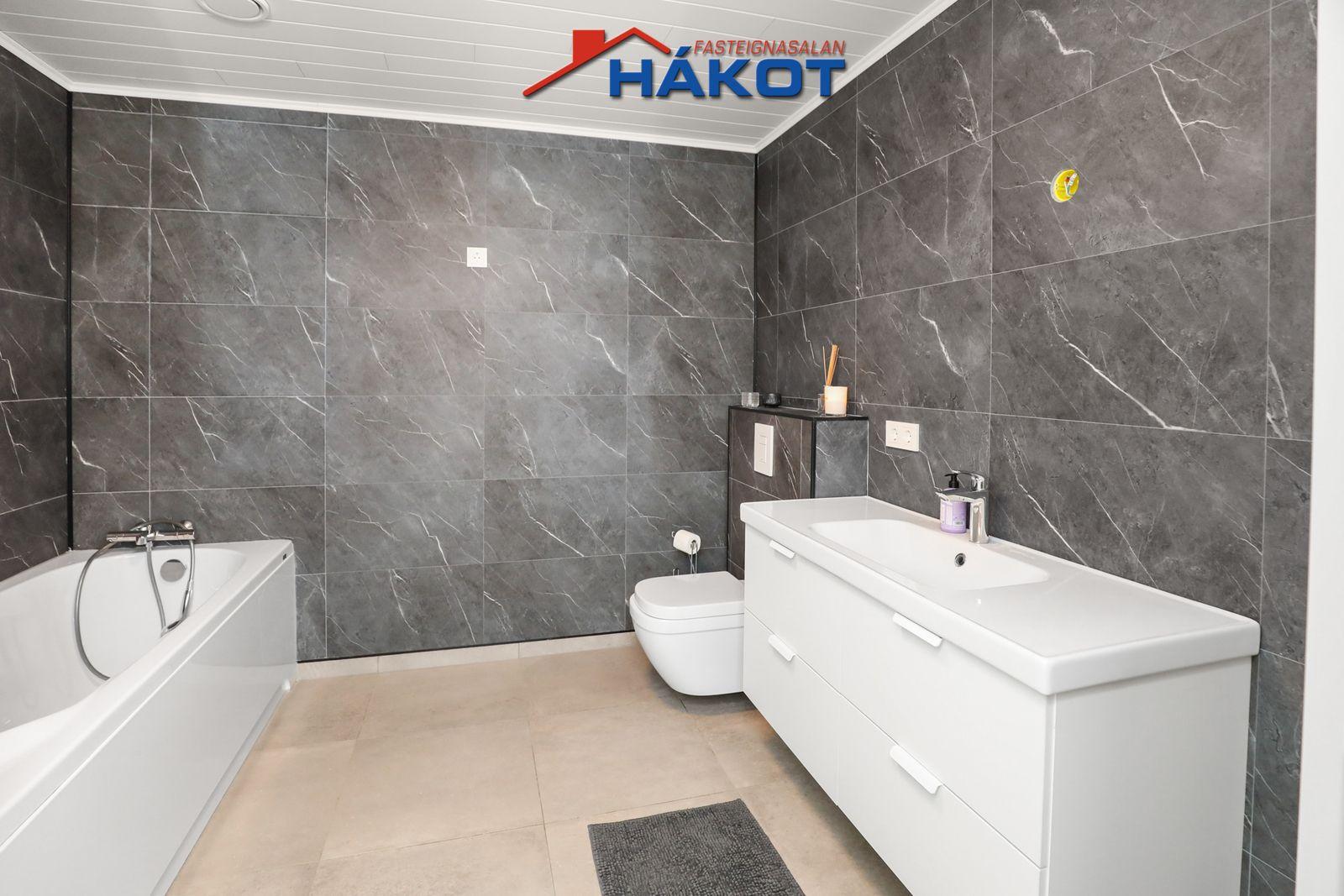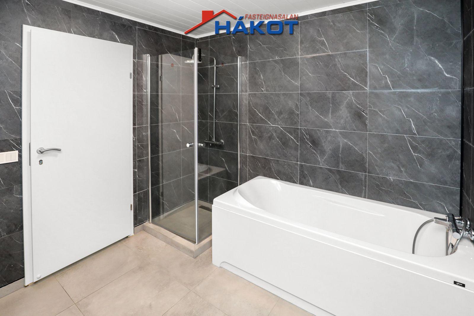 Baðherbergi 2 (flísar, flísaþyljur, baðkar, sturta, hvít innrétting, upphengt wcekki gluggi).