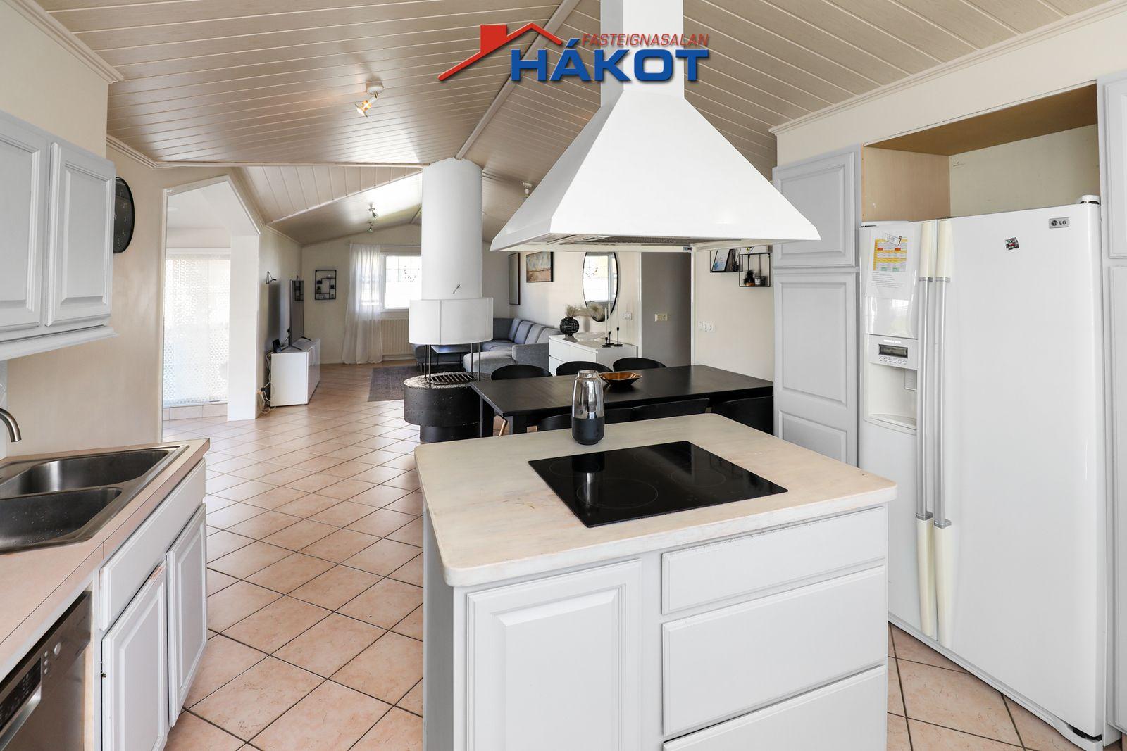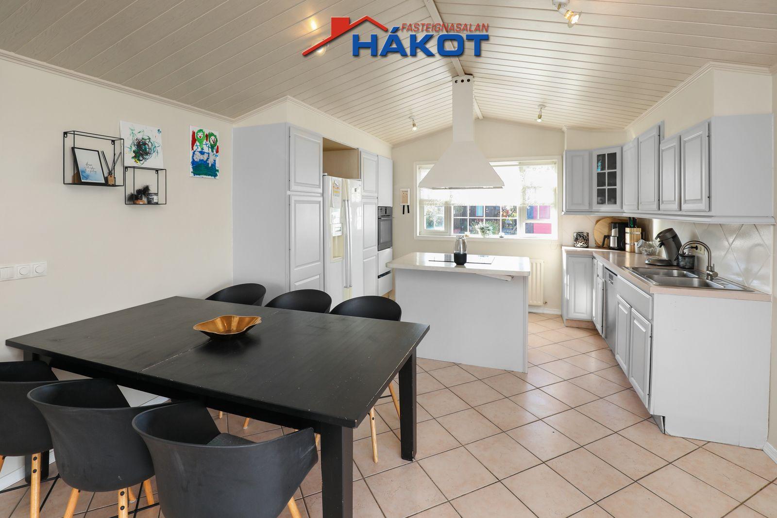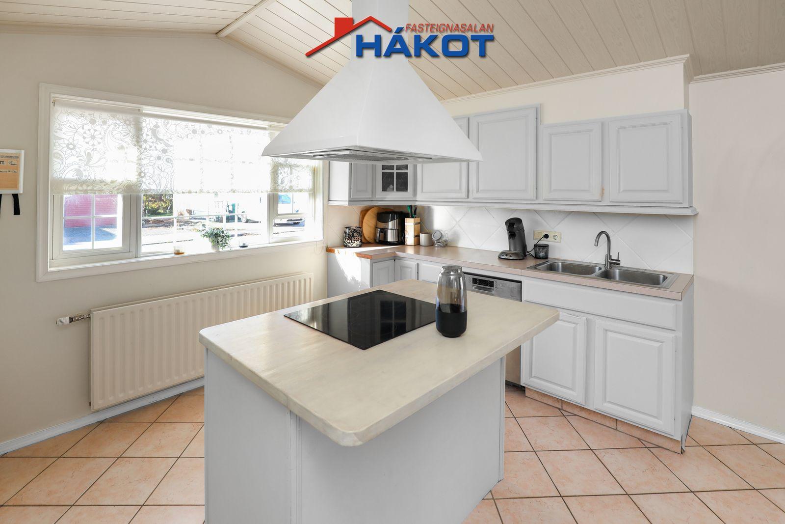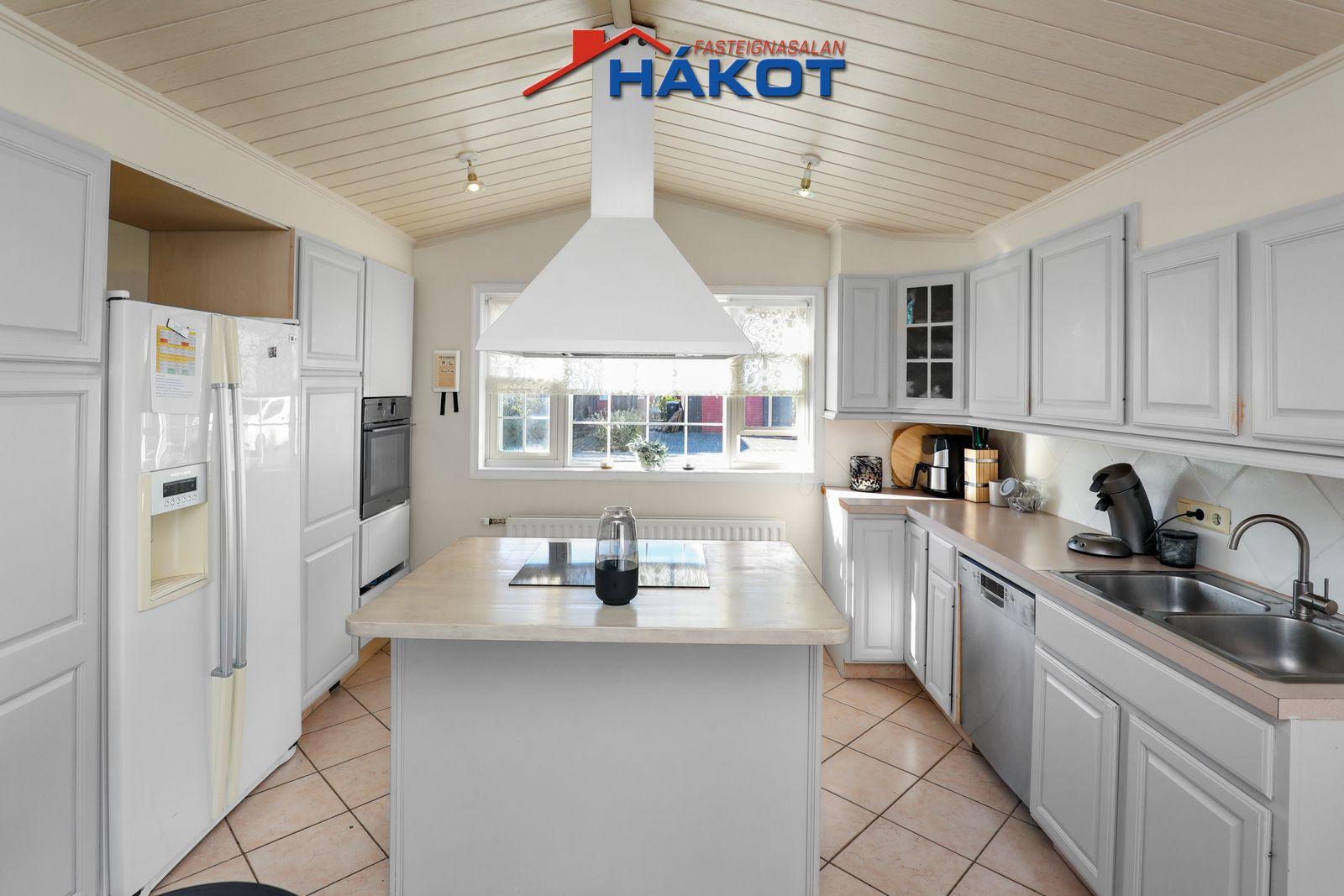 Eldhús (flísar, máluð innrétting, málaðar flísar á milli skápa, eyja m/háf, amerískur ísskápur (fylgir), helluborð, ofn, opið milli eldhúss, stofu og sólstofu).