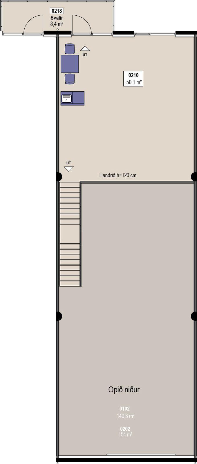Helstu stærðir: Bílskúrshurð: Hæð 4,2 m og breidd 3,5 m Lofthæð neðri hæðar: 5,72 m og 2,92 m Lofthæð efri hæðar: 2,52 m