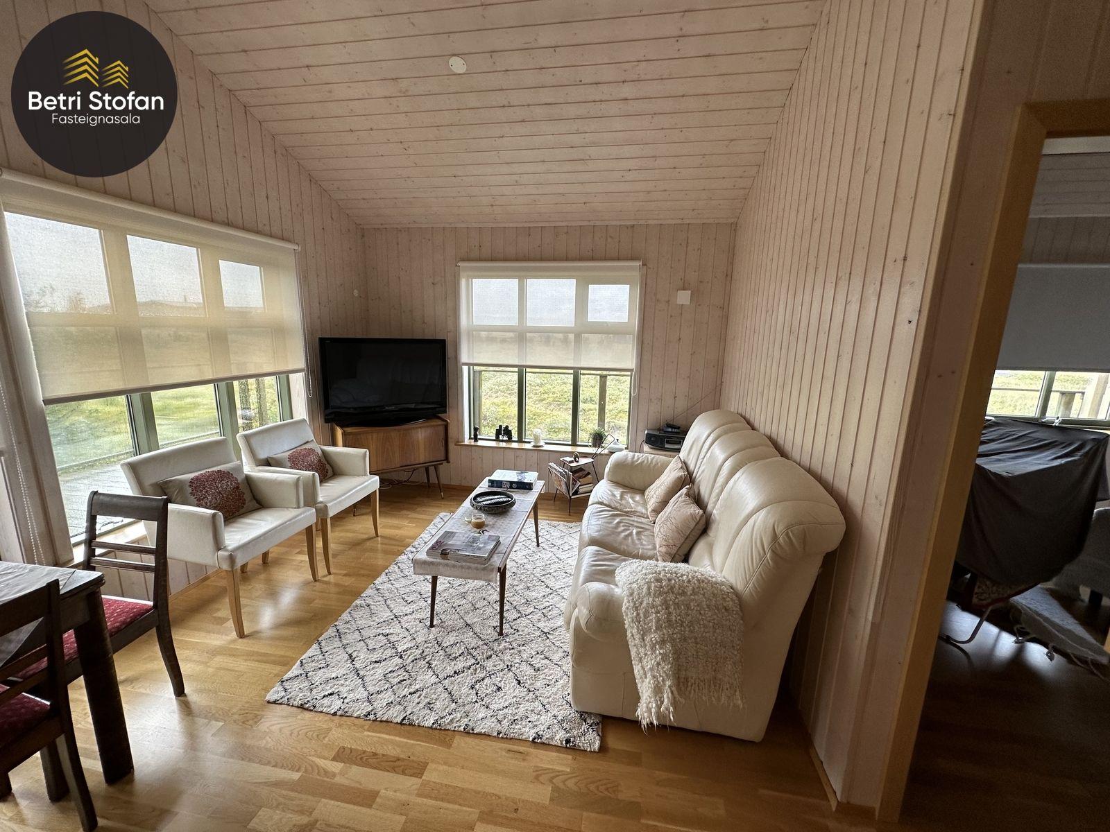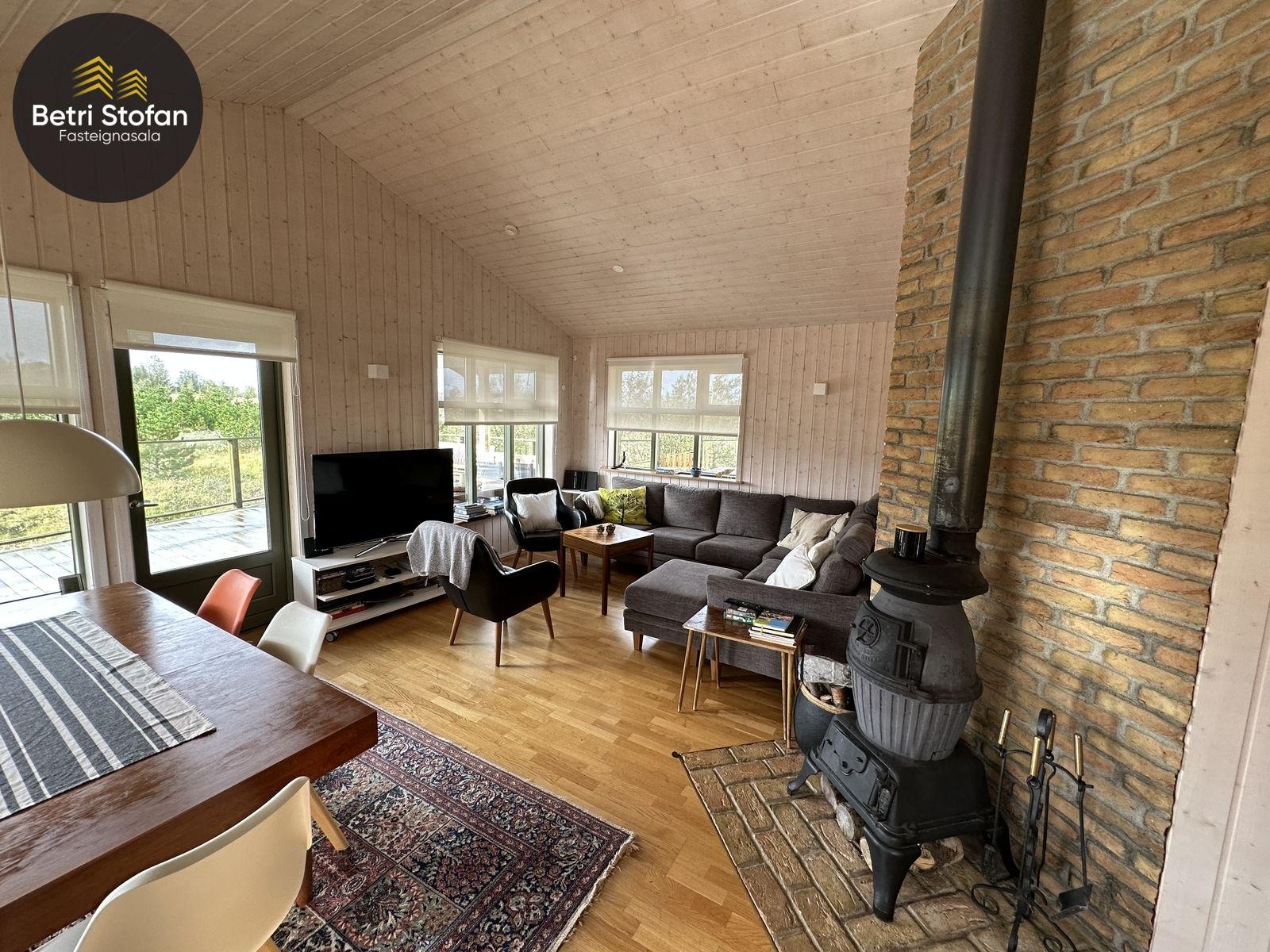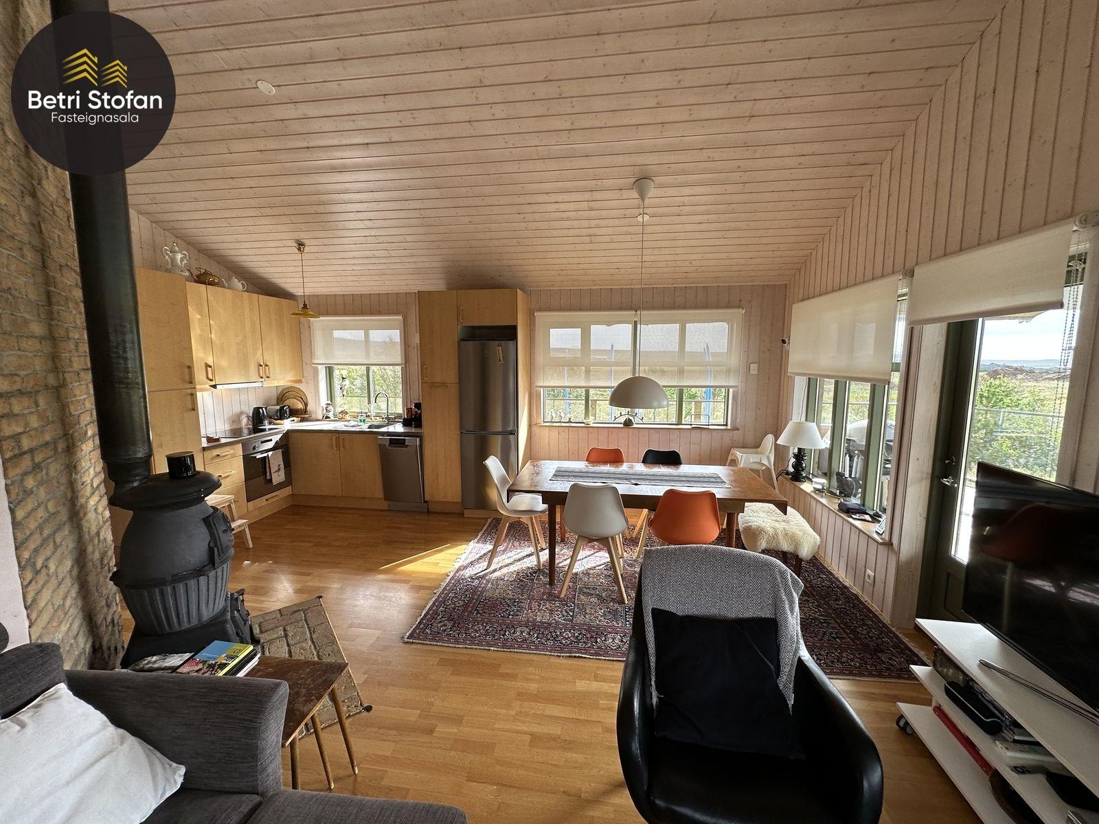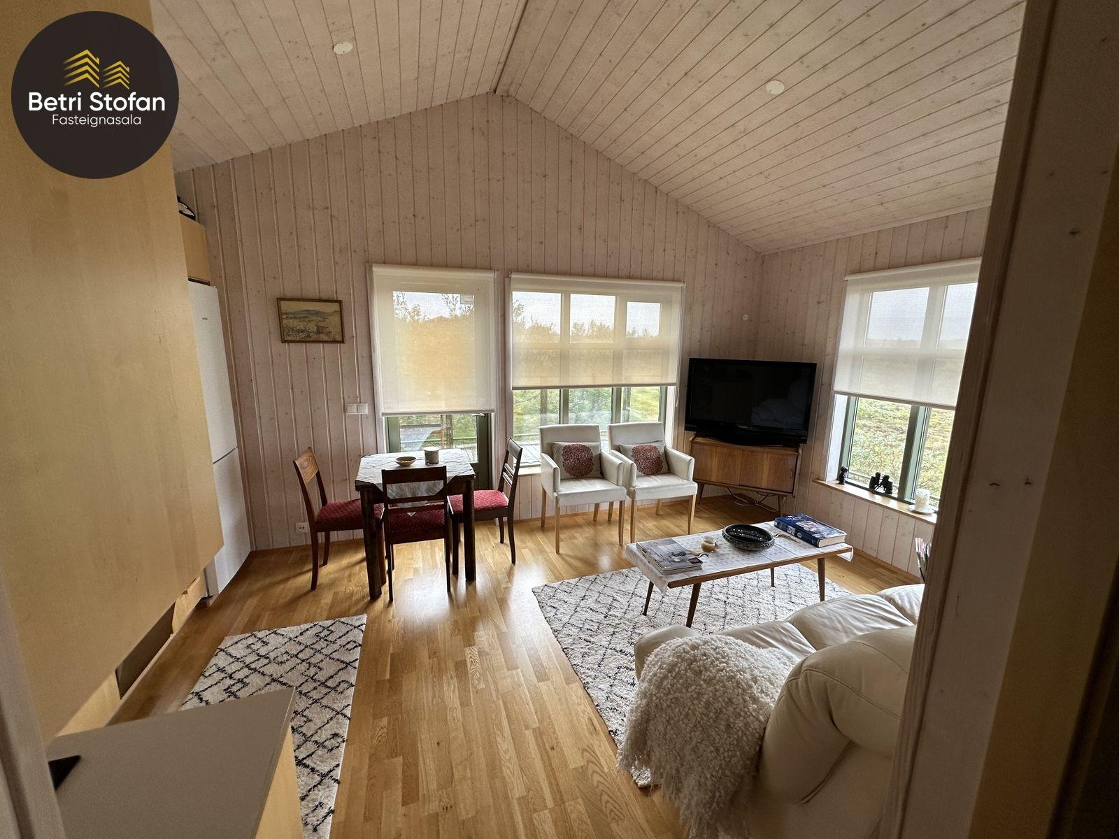 Nánari lýsing aðalhús: Komið inn í flísalagt anddyri. Eldhús með vandaðri innréttingu og tækjum. Stofa og borðstofa með góðri lofthæð, útgengi út á pall, fallegir gluggar. Hiti er í gólfum sem eru með parketi og flísum. Baðherbergi með sturtu, útgengi út á pall, flísar á gólfi. 3 svefnherbergi. Sér geymsla og inntaksrými.