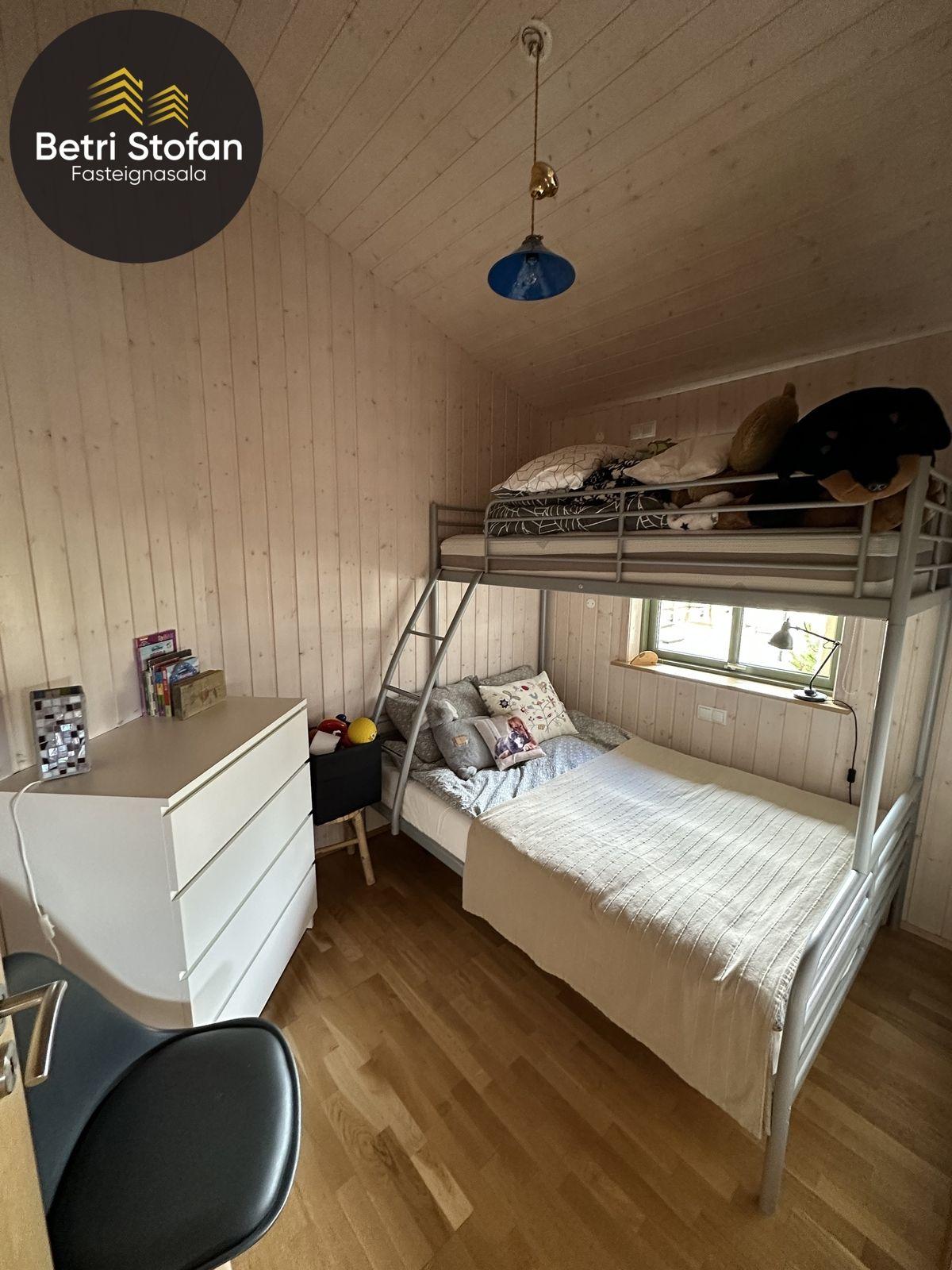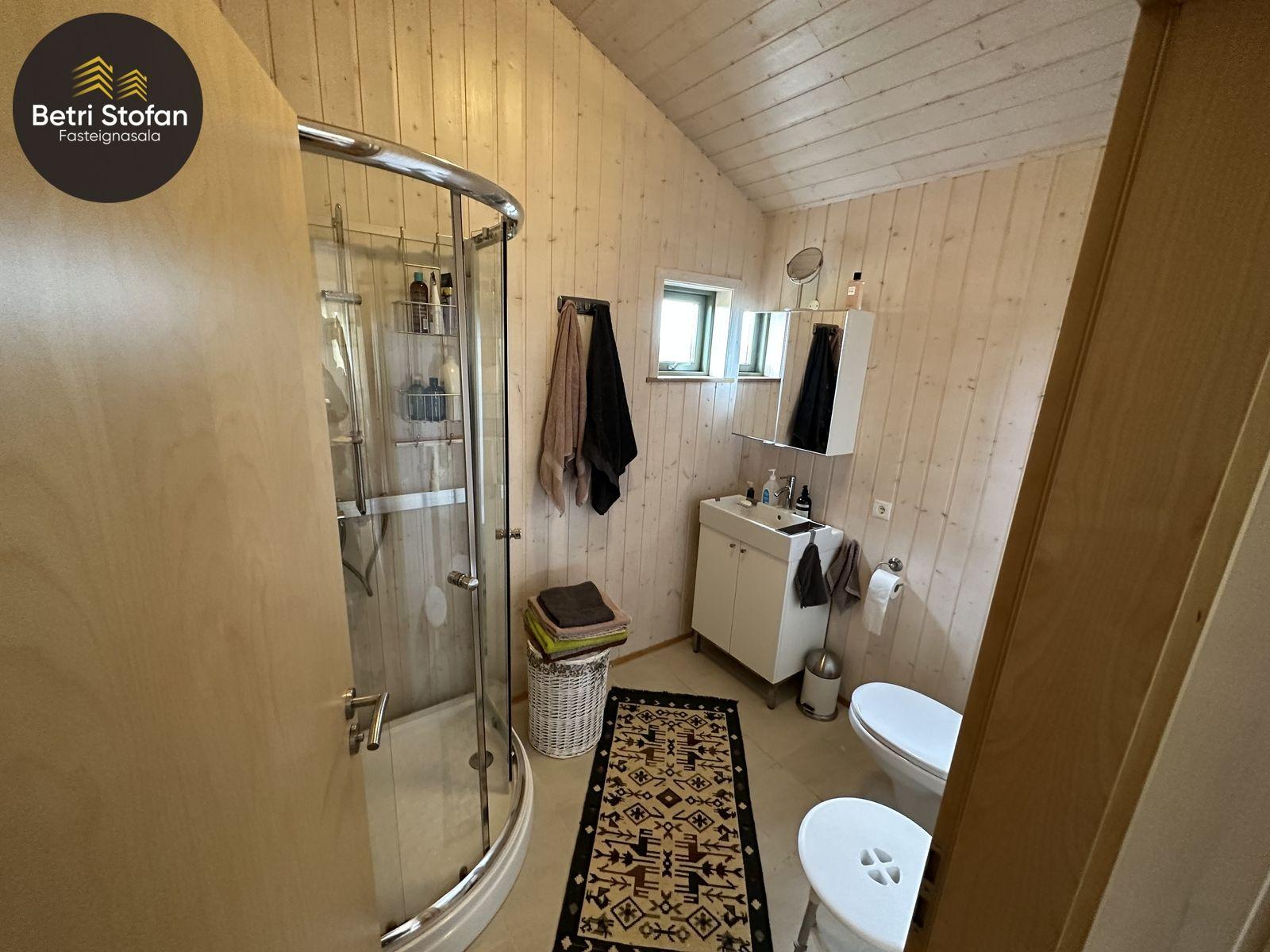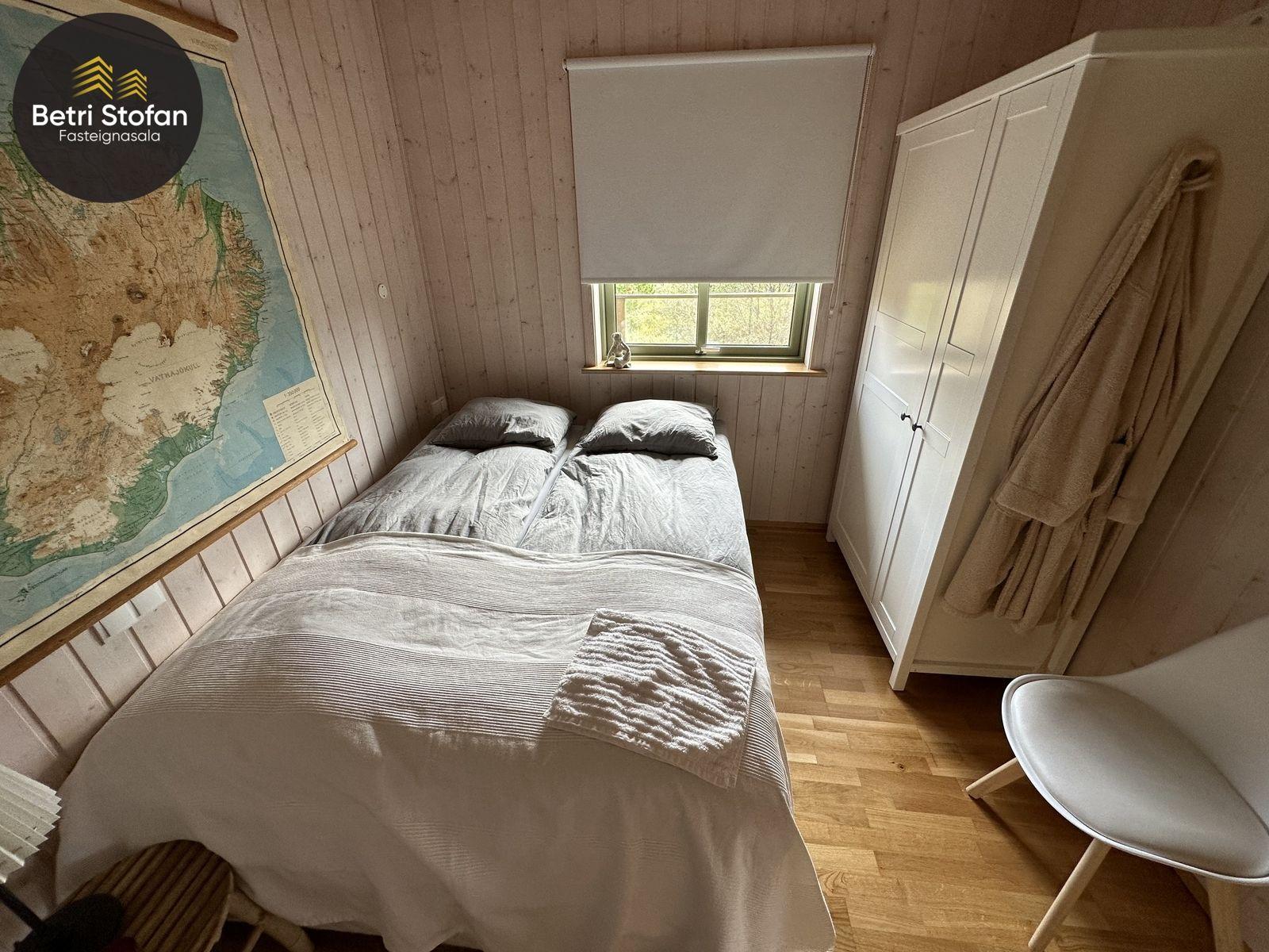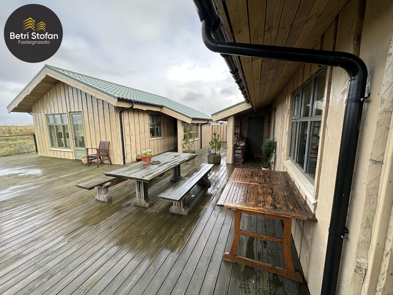 Nánari lýsing aðalhús: Komið inn í flísalagt anddyri. Eldhús með vandaðri innréttingu og tækjum. Stofa og borðstofa með góðri lofthæð, útgengi út á pall, fallegir gluggar. Hiti er í gólfum sem eru með parketi og flísum. Baðherbergi með sturtu, útgengi út á pall, flísar á gólfi. 3 svefnherbergi. Sér geymsla og inntaksrými.