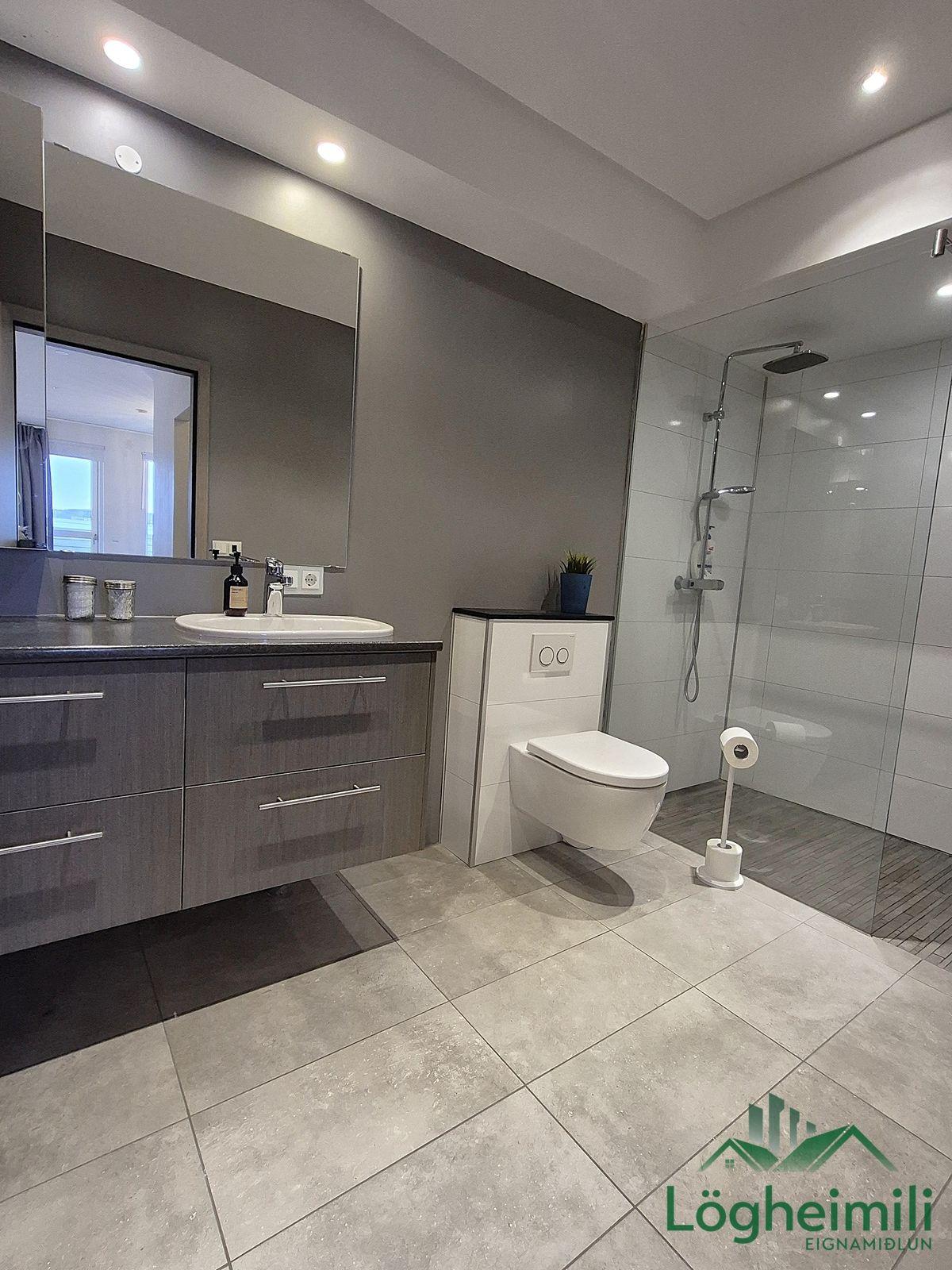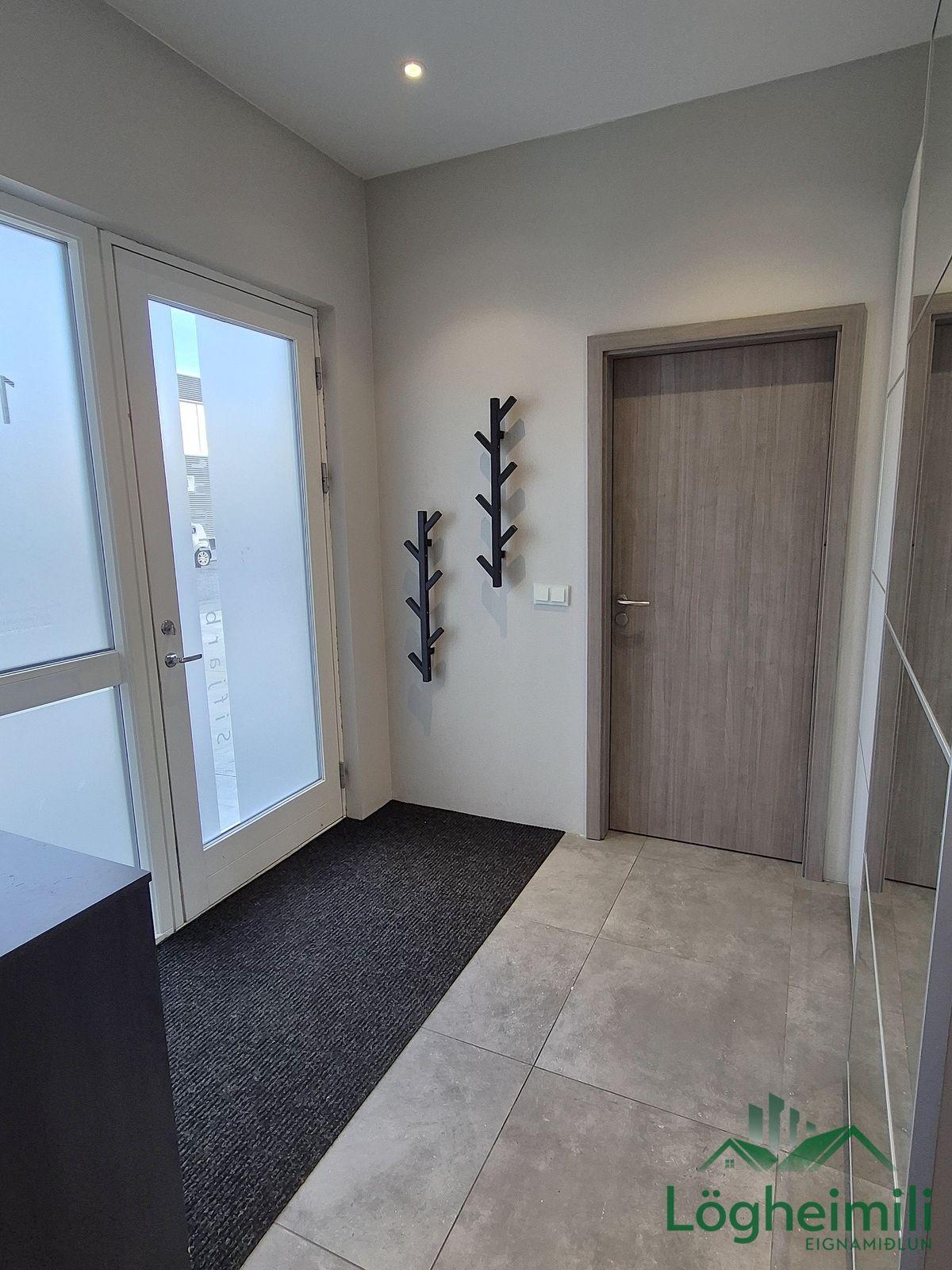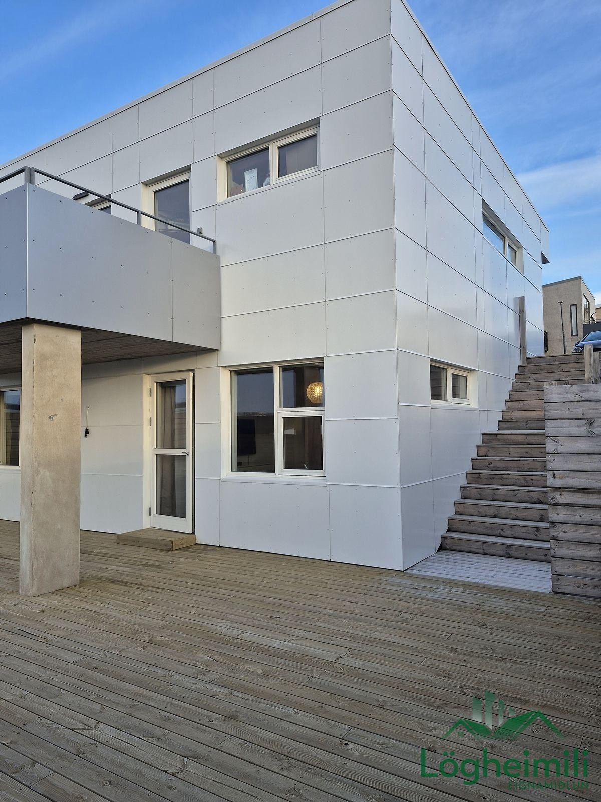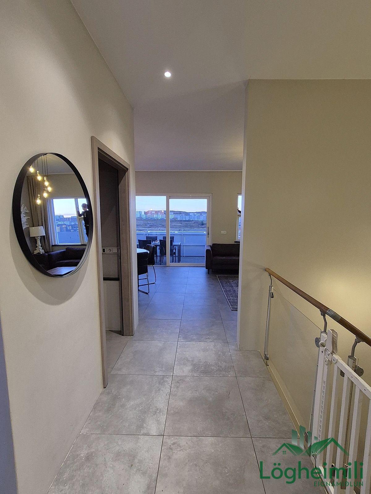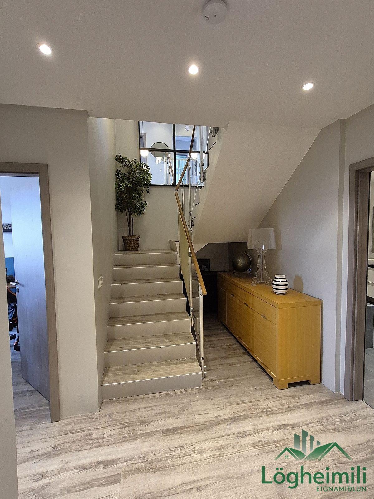 Annað: Samkvæmt fasteignayfirliti HMS er efri hæð: íbúð 68,1 fm., geymsla 9,1 fm. (sem hefur ekki verið stúkuð af í bílskúr), bílskúr 26,9 fm. og neðri hæð: íbúð 108,6 fm., eða samtals 212,7 fm., byggt árið 2016. Skipulagi hefur verið breytt frá teikningu, t.d. er þvottaherbergi þar sem sauna er á teikningu og geymsla þar sem þvottaherbergi er á teikningu. Sem endaraðhús nýtur eignin aukins næðis og betra aðgengis þar sem hægt er að ganga meðfram húsinu út á verönd.