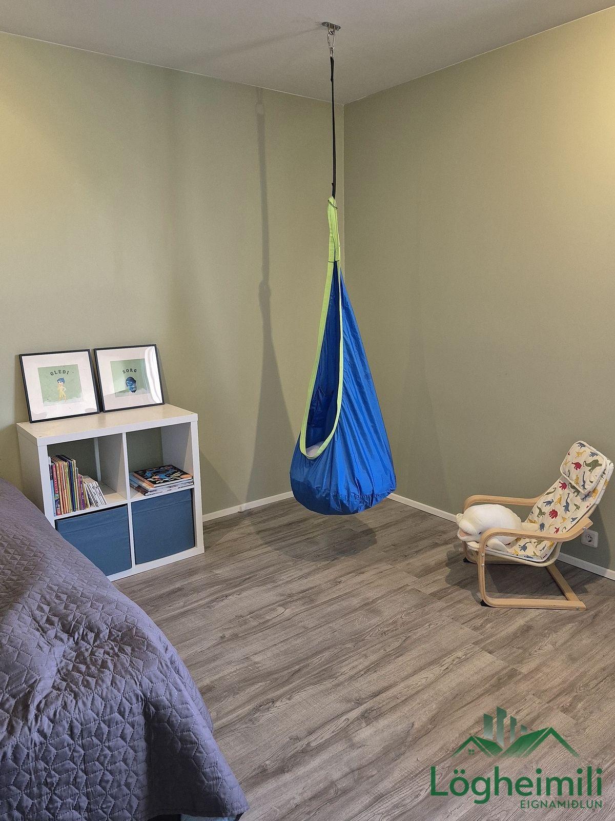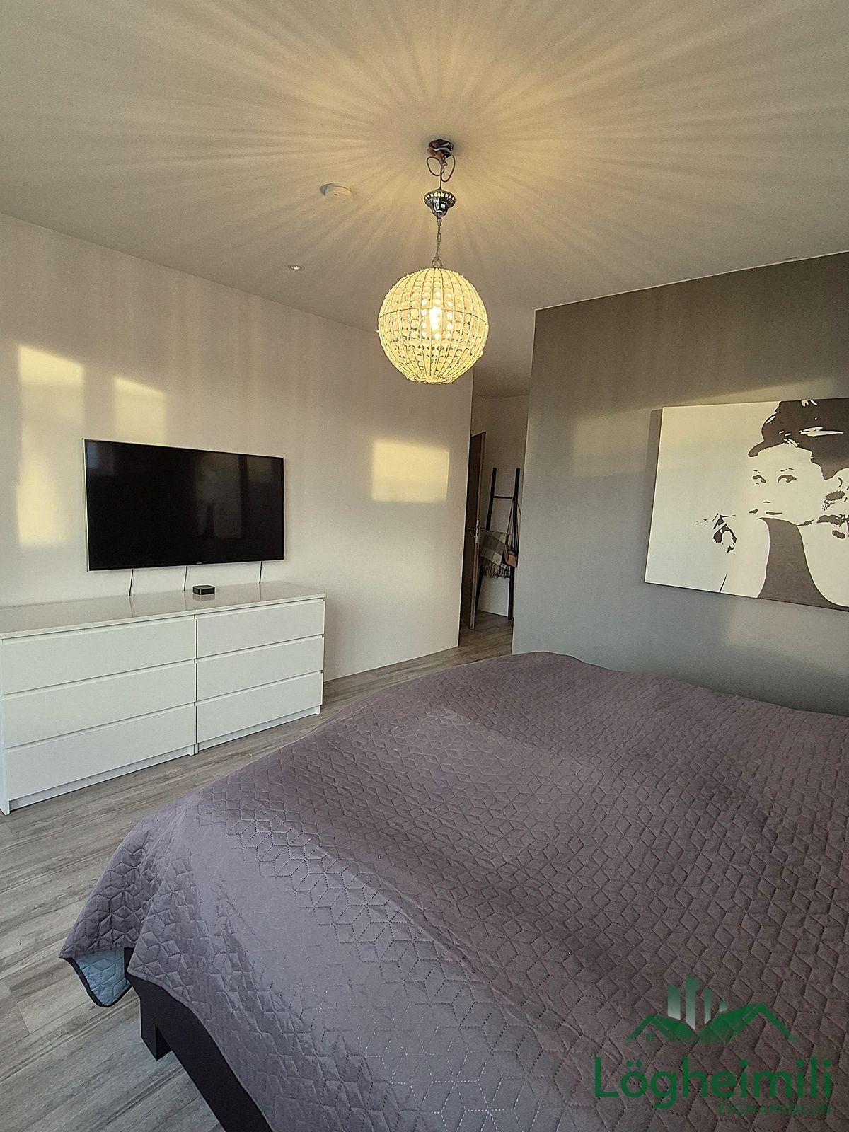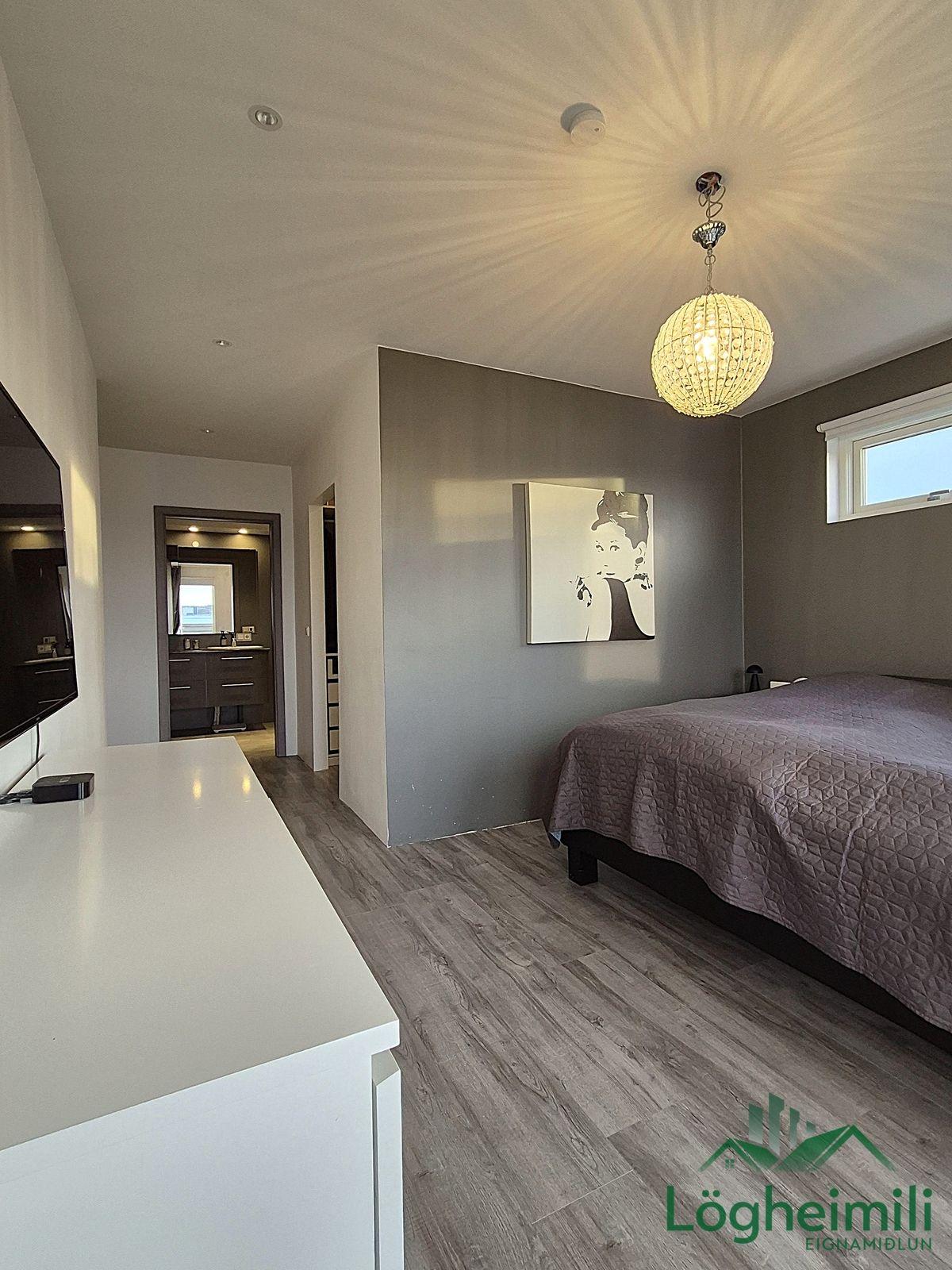Gengið er niður steyptan stiga, í gang. Hjónasvíta er með fataherbergi, sér baðherbergi með flísalagðri sturtu, handklæðaofni og vegghengdu salerni. Frá hjónaherbergi er útgengt á stóra suðurverönd. Tvö rúmgóð barnaherbergi. Í rúmgóðu baðherbergi er falleg hvít innrétting undir vask, baðkar og flísalögð sturta. Þvottaherbergi, sem er inn af baðherbergi, er með hvítri innréttingu, skolvask í vinnuborði og góðu skápaplássi. Geymsla með skolvask er á neðri hæð. Plastparket er á gólfum, nema á baðherbergjum, þvottaherbergi og geymslu þar sem eru flísar.