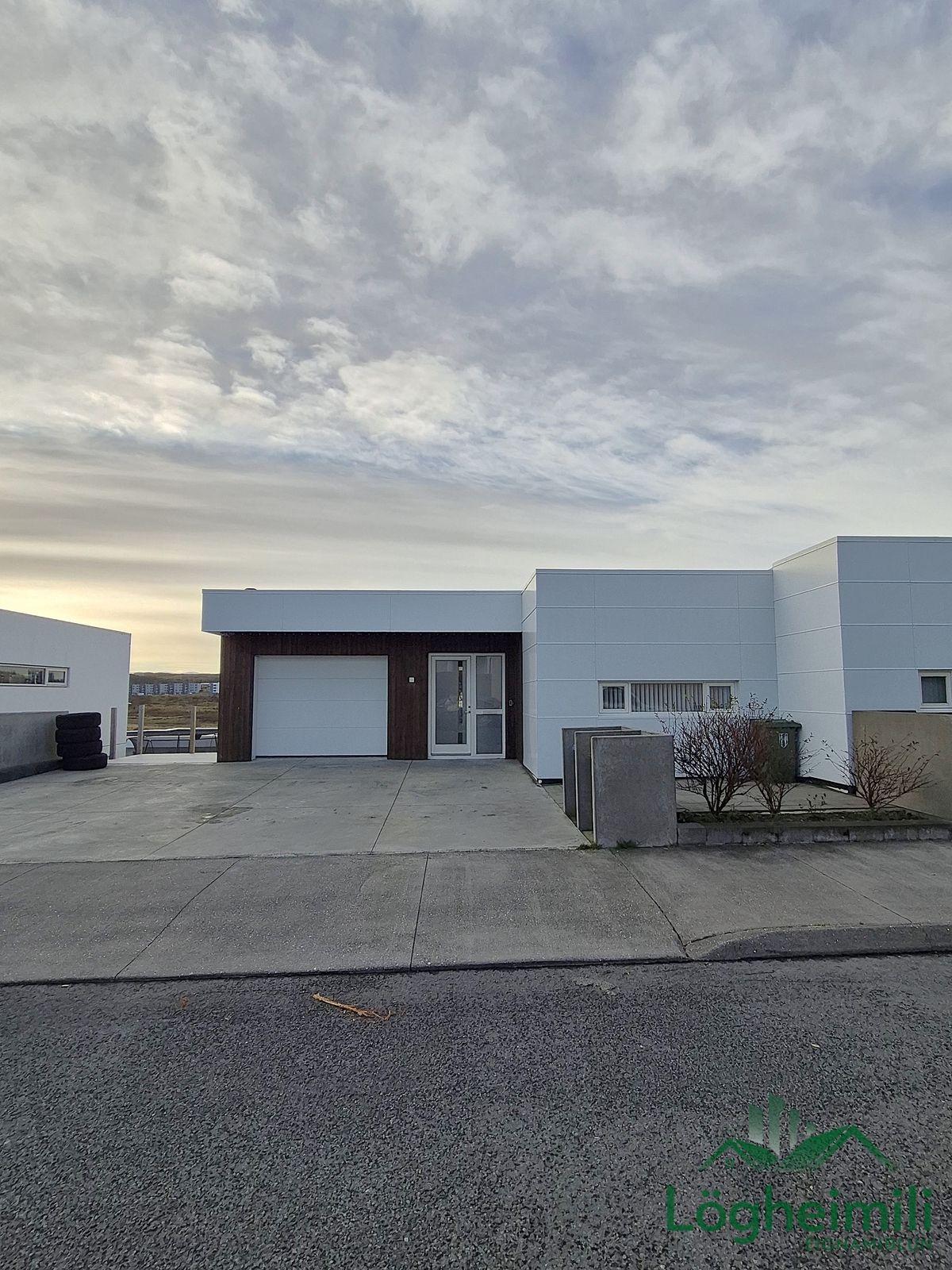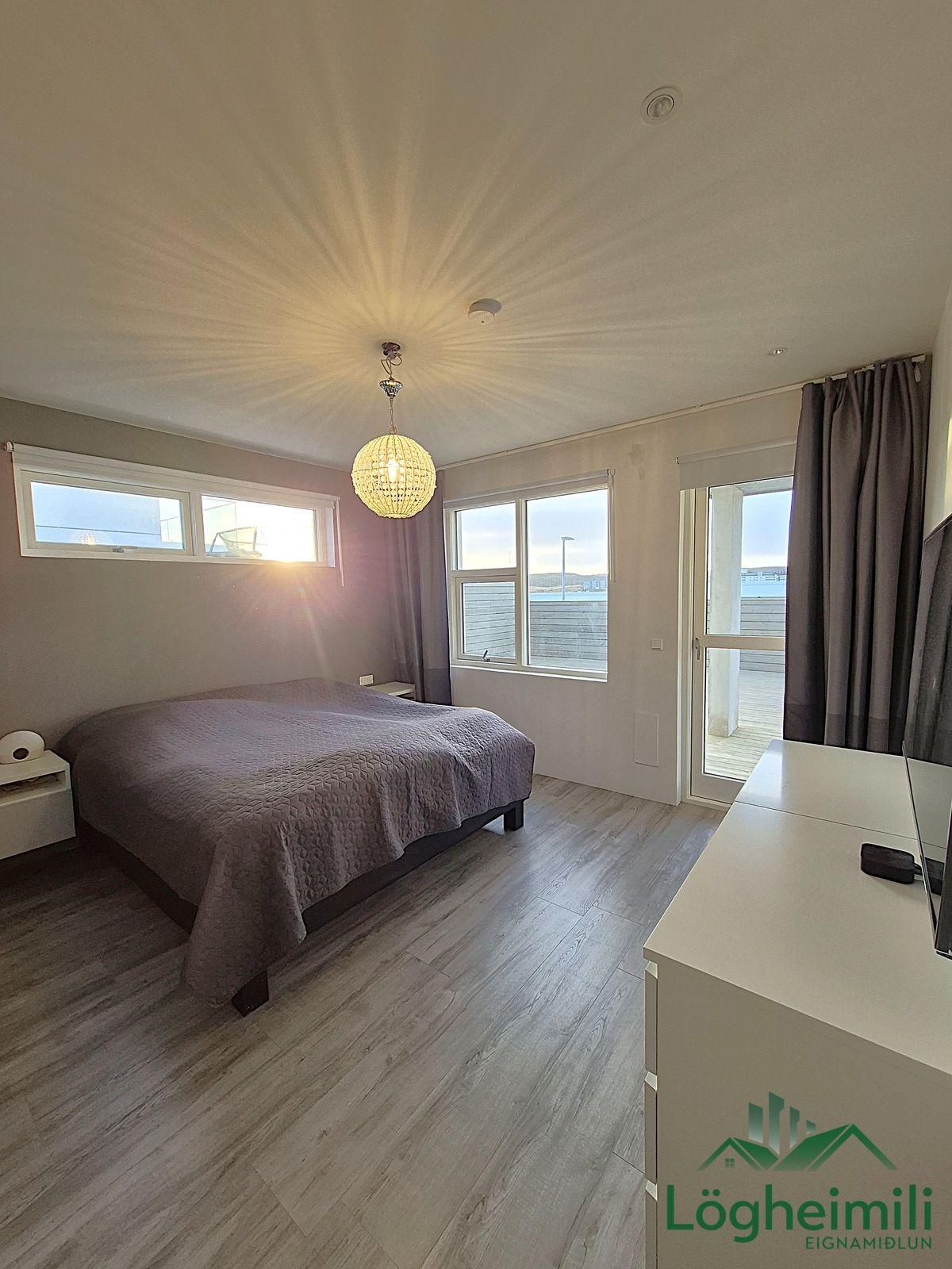 Innbyggður bílskúr er með rafdrifinni bílskúrshurð, opnalegum gluggum, litlu geymslulofti, epoxy á gólfi, auk þess sem útgengt er á svalir með útsýni.