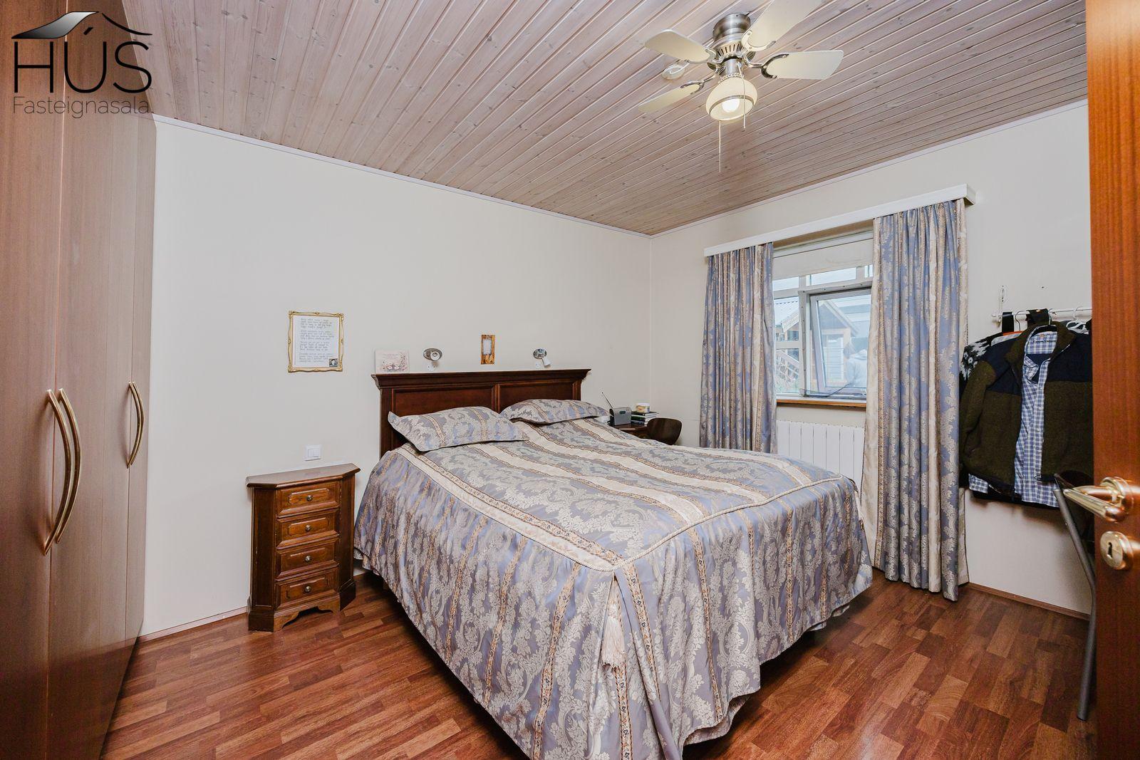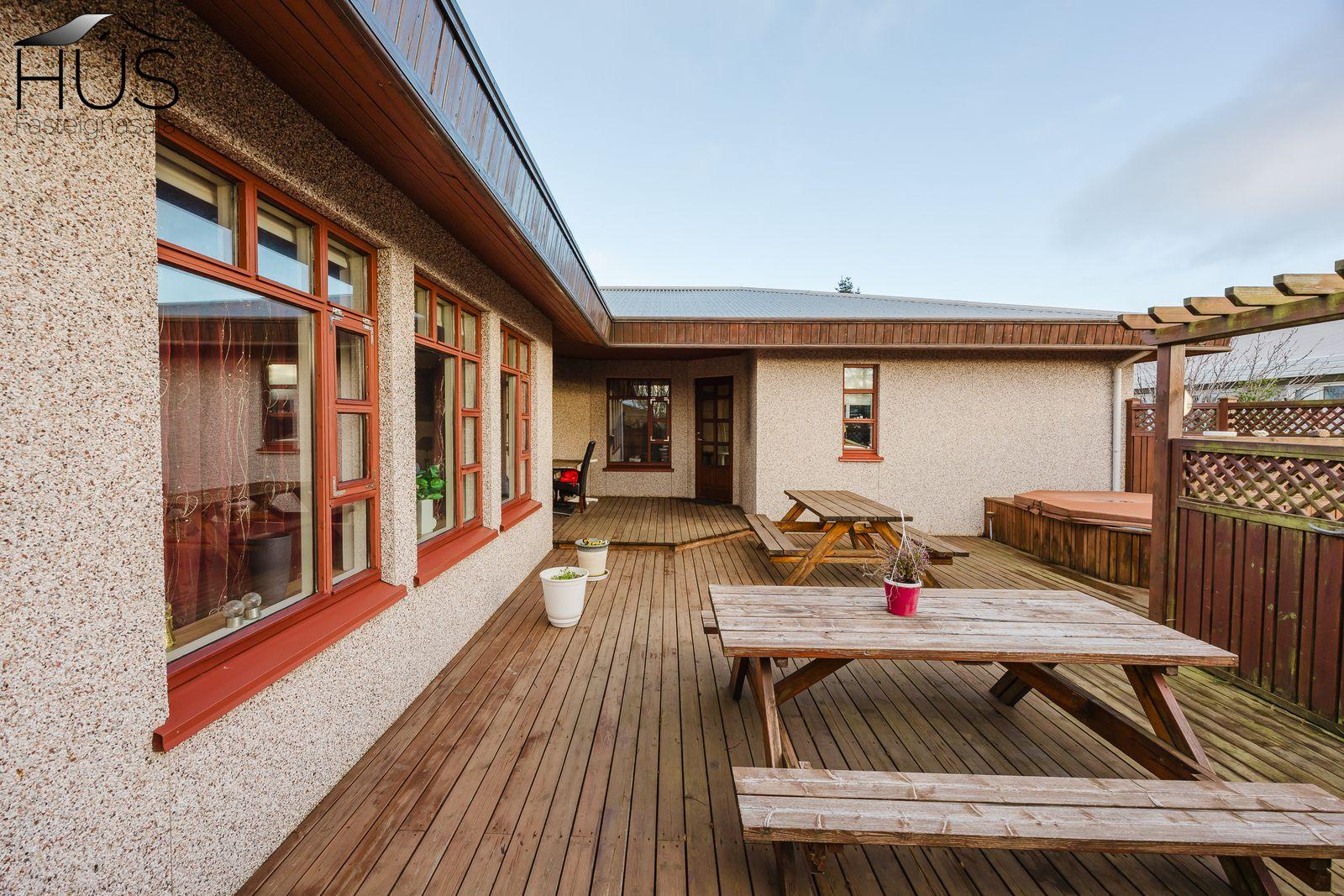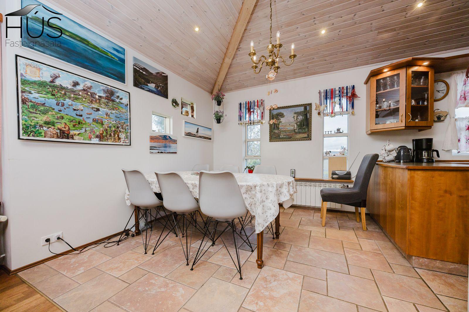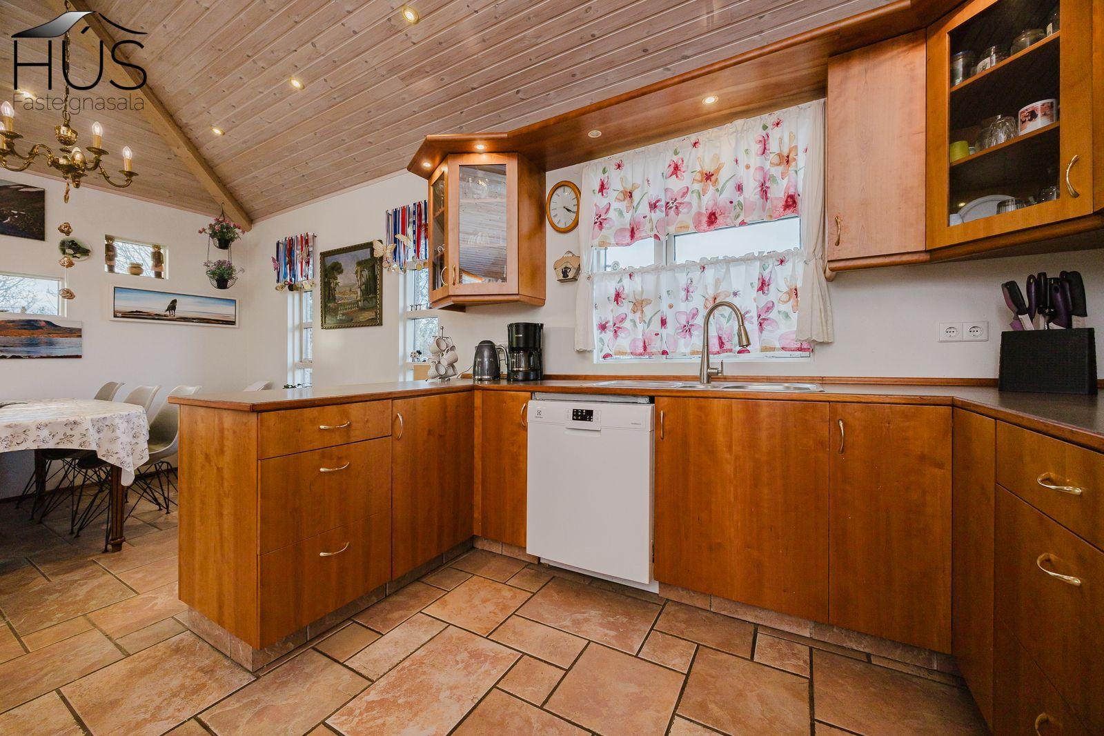 Nánari lýsing: Fimm góð svefnherbergi eru í húsinu, öll með fataskápum. Flísalögð forstofa með góðum fataskáp. Stórt og bjart miðrými hússins telur rúmgott sjónvarpshol, eldhús og borðstofu sem aðeins er stúkað af og síðan er stofa. Úr stofunni er útgengt út á sólpall. Í þessu rými er upptekið loft, hvíttaður panill með innfelldri ledlýsingu. Í eldhúsi er snyrtileg upprunaleg innrétting með góðu skápaplássi og glerskápum að hluta. Baðherbergi með innréttingu, sturtu og flísalagt í hólf og gólf. Þvottahús , úr því er innangengt í rúmgóðan, snyrtilegan og bjartan tvöfaldan bílskúr. Í bílskúr er geymslulofti. Á gólfum eru annars vegar drappaðar flísar og hins vegar parket.