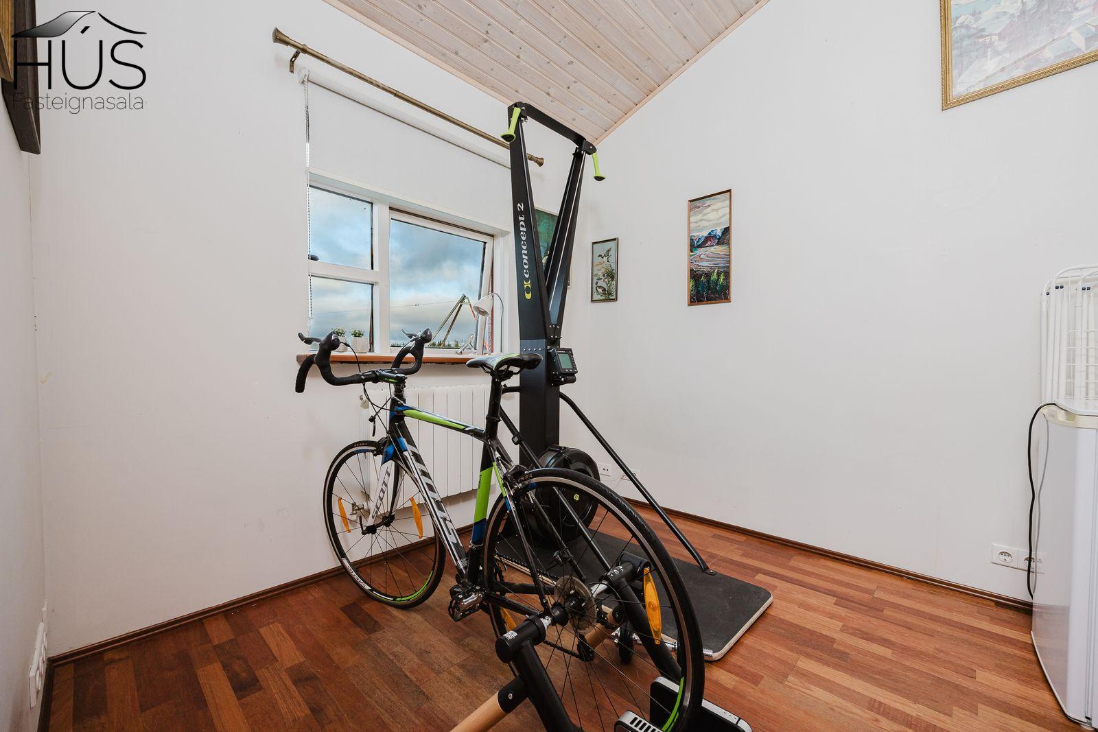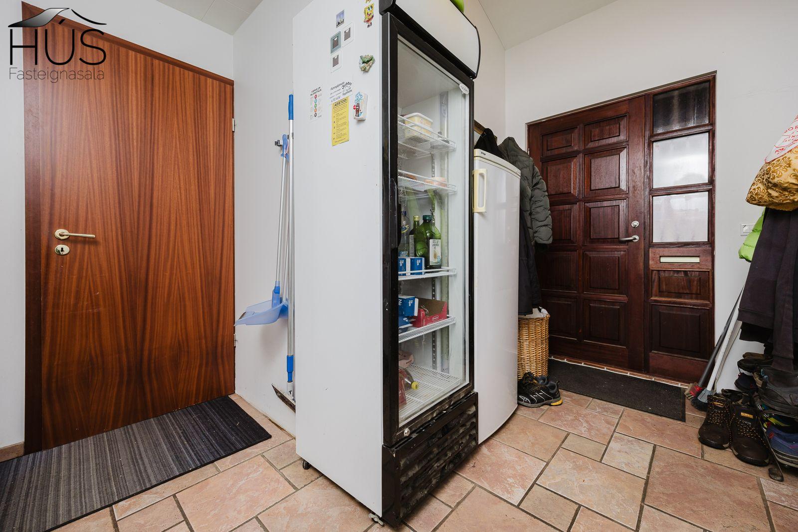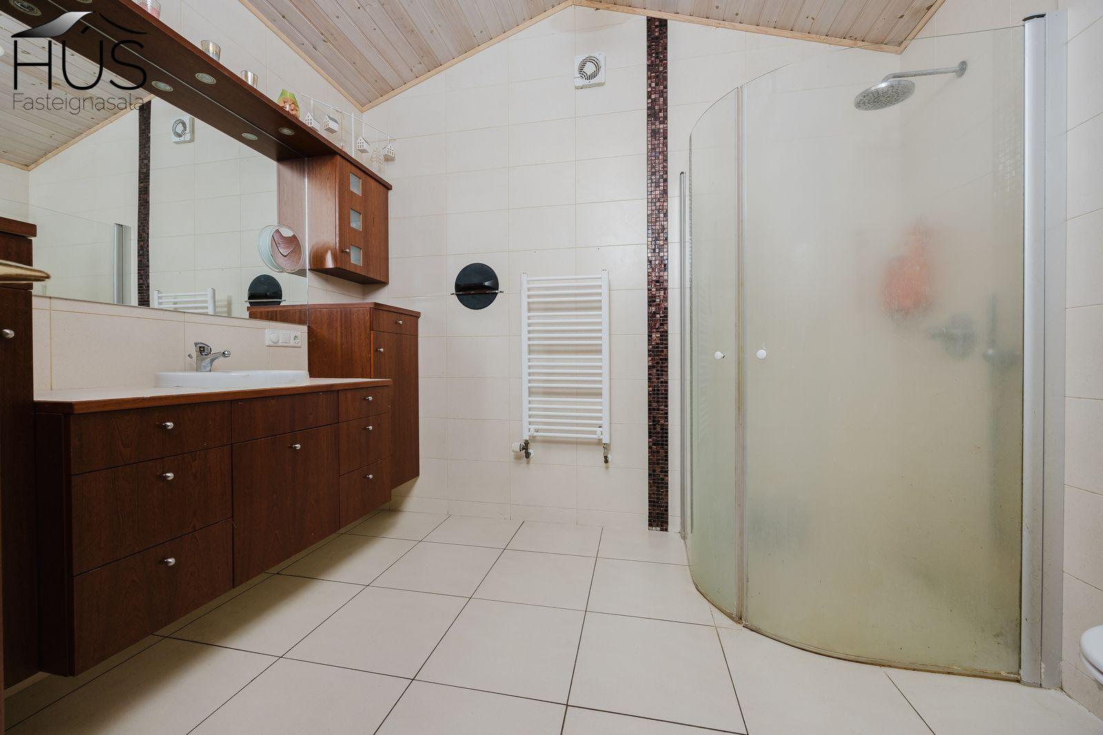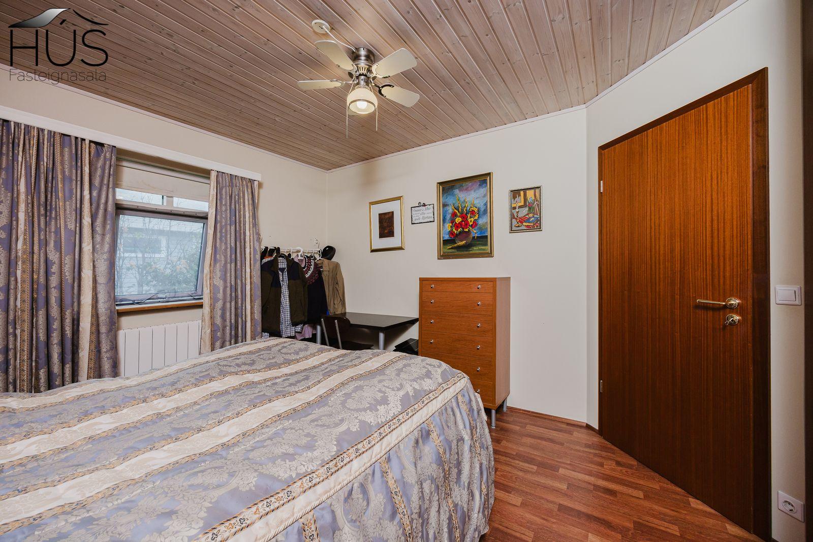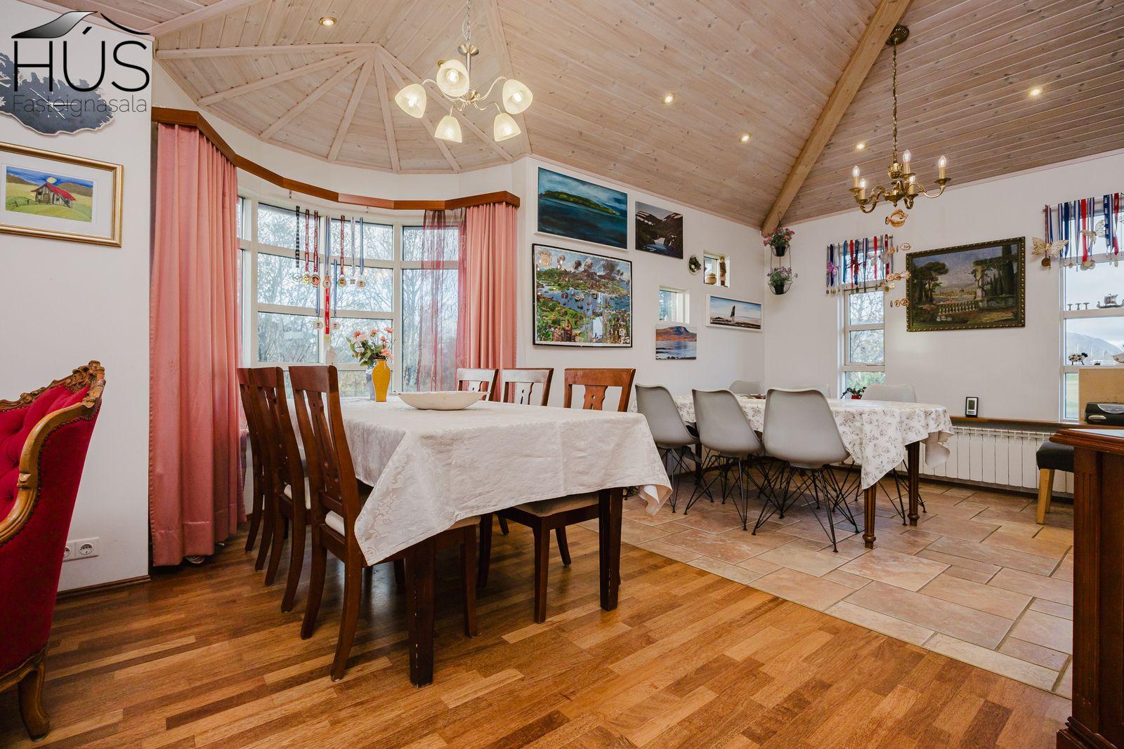 Nánari lýsing: Fimm góð svefnherbergi eru í húsinu, öll með fataskápum. Flísalögð forstofa með góðum fataskáp. Stórt og bjart miðrými hússins telur rúmgott sjónvarpshol, eldhús og borðstofu sem aðeins er stúkað af og síðan er stofa. Úr stofunni er útgengt út á sólpall. Í þessu rými er upptekið loft, hvíttaður panill með innfelldri ledlýsingu. Í eldhúsi er snyrtileg upprunaleg innrétting með góðu skápaplássi og glerskápum að hluta. Baðherbergi með innréttingu, sturtu og flísalagt í hólf og gólf. Þvottahús , úr því er innangengt í rúmgóðan, snyrtilegan og bjartan tvöfaldan bílskúr. Í bílskúr er geymslulofti. Á gólfum eru annars vegar drappaðar flísar og hins vegar parket.