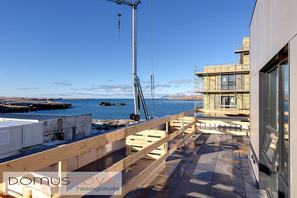 Svalir til suðurs út frá stofu. Útsýni til sjávar frá stofu og eldhúsi.