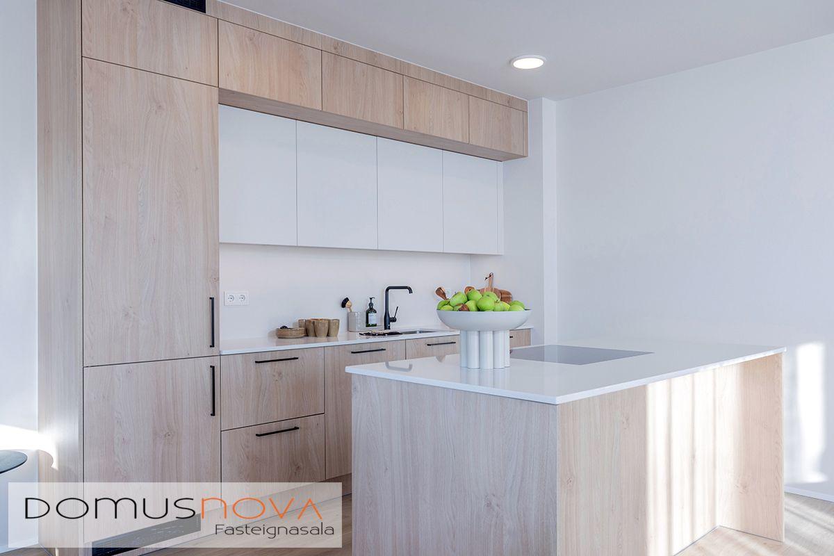 Eldhús með eyju, góðu skápaplássi og innbyggð ísskápur, frystir og uppþvottavél. Innrétting er vönduð með