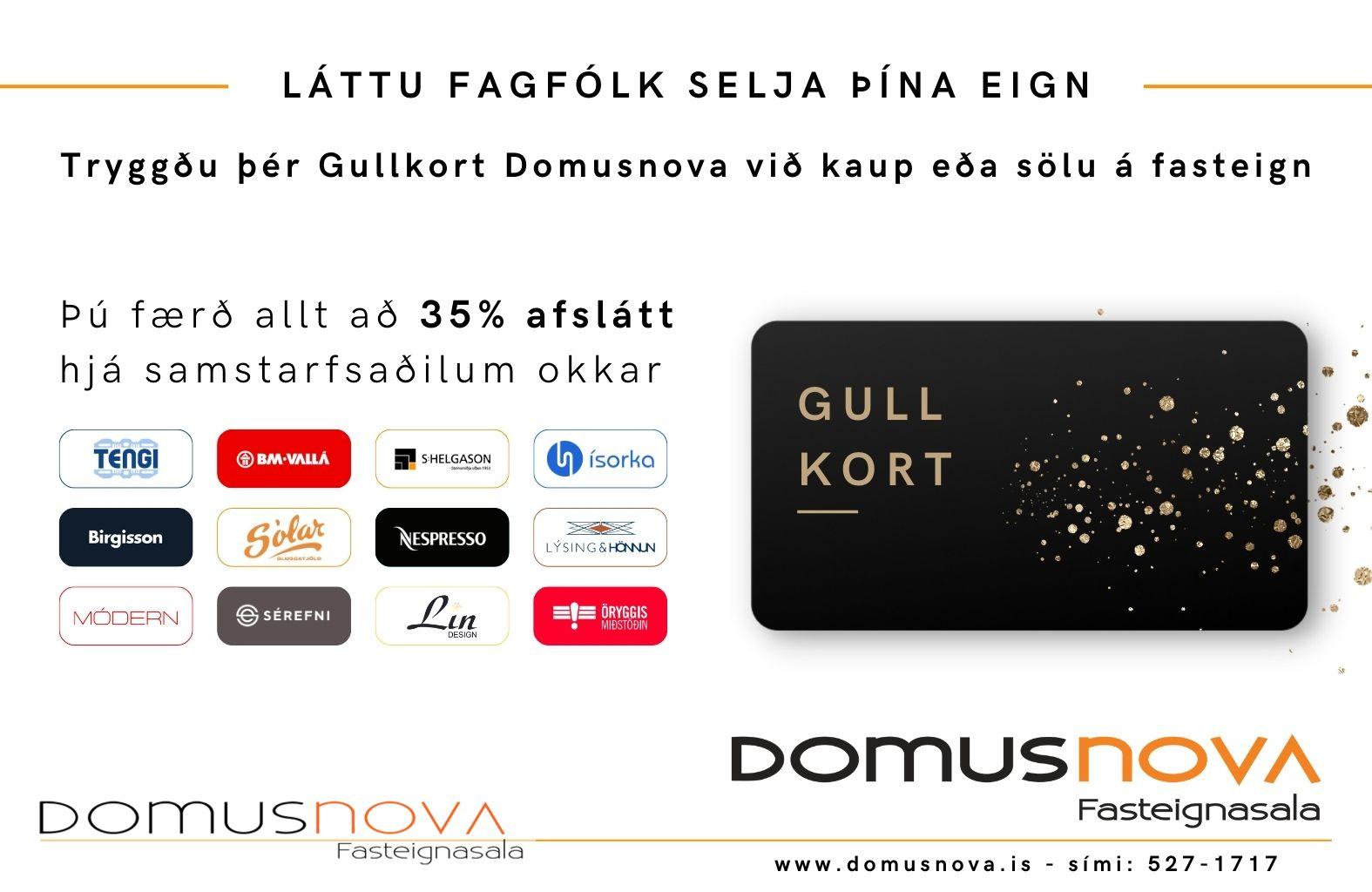 Allir kaupendur og seljendur okkar fá Gullkort Domusnova. Handhafar gullkortsins fá allt að 35% afslátt hjá 12 samstarfsaðilum okkar: S. Helgason, Sérefni, Birgisson, Módern, Lín design, Tengi, Nespresso, Öryggismiðstöðin, Ísorka, Lýsing og hönnun, Sólar gluggatjöld og Bm Vallá. Lýsing íbúðar:Forstofa rúmgóð með stórum fataskáp
