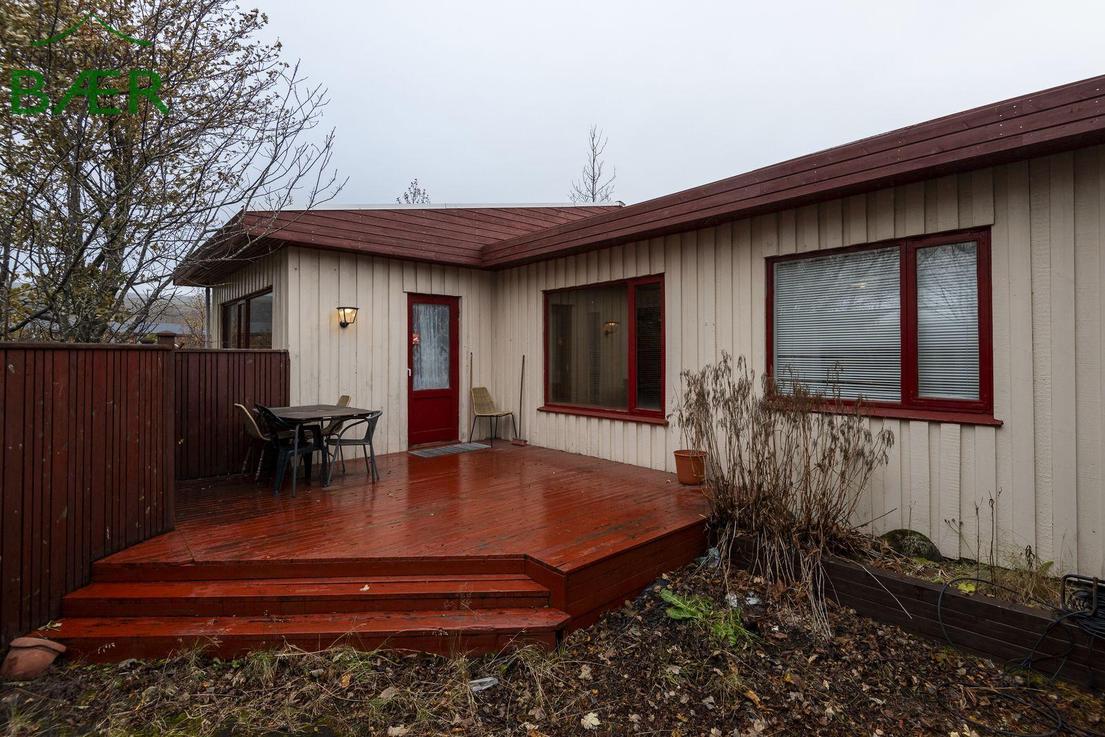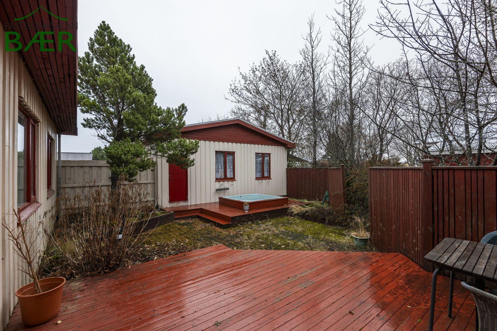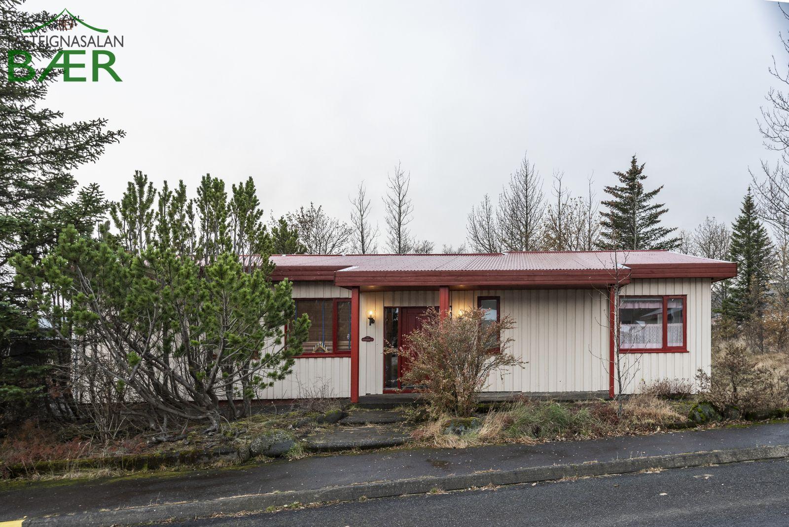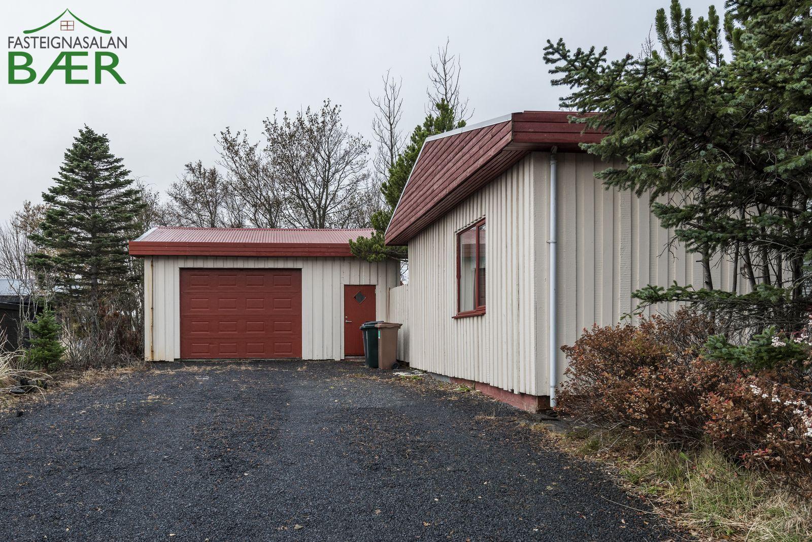 Nánari lýsing: Forstofa, fjögur svefnherbergi, stofa, eldhús, sjónvarpshol, baðherbergi, gestasnyrting, þvottaherbergi og bílskúr. Forstofa með flísum á gólfi og fataskáp. Gestasnyrting er inn af forstofu flísalögð í hólf og gólf og með glugga. Eldhús með flísum á gólfi, eldri innrétting og borðkrókur. Þvottaherbergi er inn af eldhúsi með flísum á gólfi, innréttingu og lúgu upp í þakgeymslu sem er yfir nánast öllu húsinu. Stofa/borðstofa með parket á gólfi og útgengi út á sólpall í suður. Sjónvarpshol með flísum á gólfi. Baðherbergi er flísalagt í hólf og gólf, hornbaðkar með sturtu, innrétting og salerni. Svefnherbergin eru 4 eitt með fataskápum, tvö með parketi og tvö með kork á gólfum. Bílskúr er rúmgóður og bjartur með geymslulofti yfir hluta skúrsins, tvær gönguhurðar og ein bílskúrshurð með rafmagns opnun. Húsið hefur verið í góðu viðhaldi: Þakkantur endurnýjaður 2021 á húsi og bílskúr, timburklæðning utan á húsi var endurnýjuð 2021 að stórum hluta, ásamt einum glugga í austur. Húsið er í enda götunnar og er opið svæði vestan við húsið sem ekki verður byggt á. Flott eign á góðum stað og stutt í alla þjónustu.
